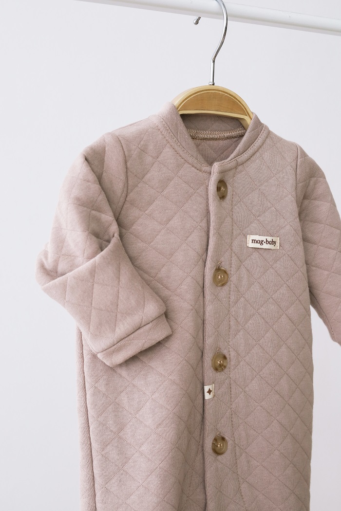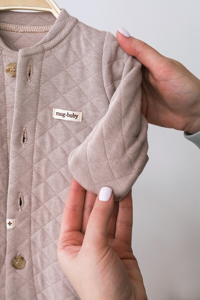 Звичайно ви зрозуміли до чого я веду. До того, що цей ось чоловічок в собі усе це і поєднує. Чоловічок має застібку в дві ніжки, означає зручно. Виконаний з утепленої тканини - два шари трикотажу простьобаного тоненьким шаром синтепона, означає теплий. І оскільки трикотаж бавовняний з лиця та вивороту, означає натуральний. Красивим його робить текстура тканини, нашивка і гудзики. На рукавцях у розмірі 62, 68 вбудовані царапки.