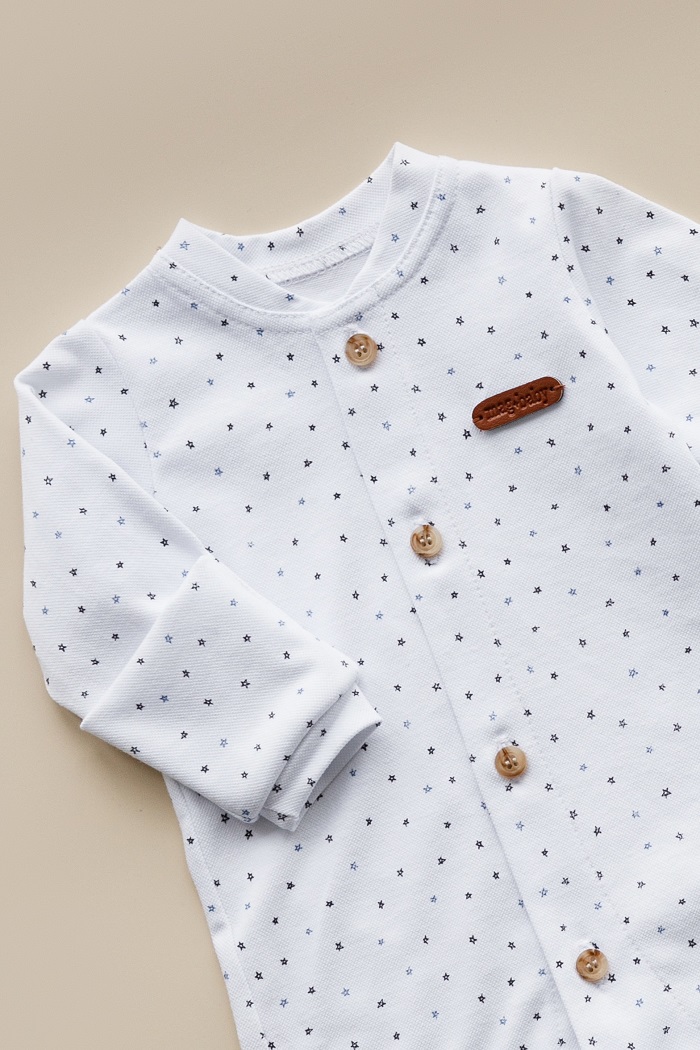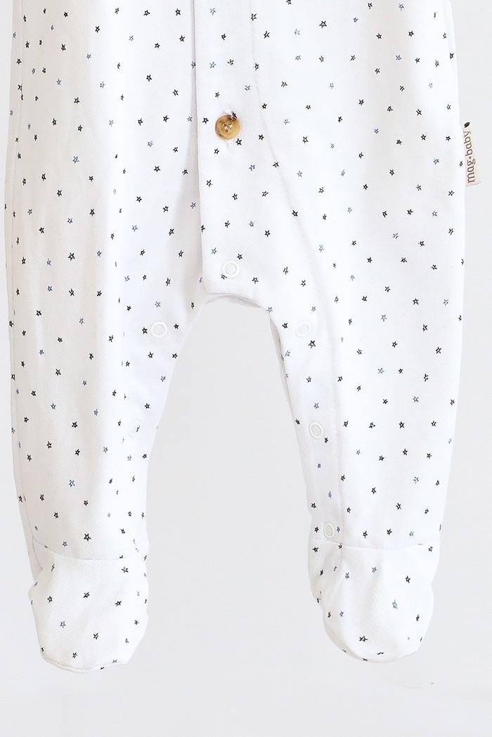 Спереду чоловічок застібається на гудзики, які надають йому "родзинку". А ось знизу, між ніжок, чоловічок застібається на кнопки, для зручнішого використання та зміни підгузника. Також спереду має шкіряну нашивку.