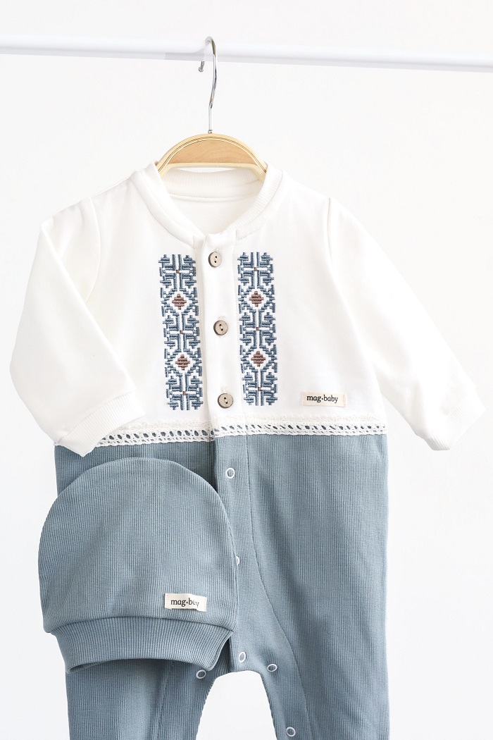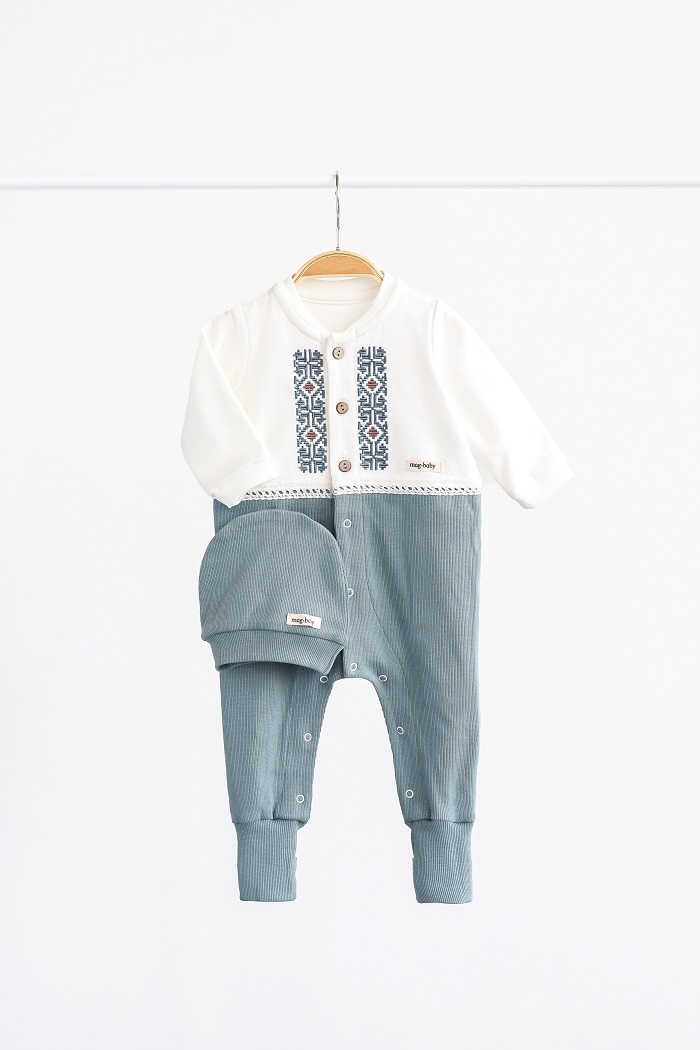 Чоловічок просто чудовий! Гармонійне поєднання кольорів, а вишивка робить його святковим та ошатним. Дуже зручно одягати, тканина приємна на дотик. Закльопки пришиті якісно й зовсім не подразнюють шкіру. Продуманий фасон – навіть якщо костюмчик трохи завеликий і підвернути, він виглядає охайно. Симпатична шапочка додає завершеного вигляду.