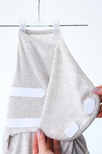 - Загортаємо малюка відворотами. Для початку фіксуємо лівим крилом, а потім правим і закріплюємо липучкою.