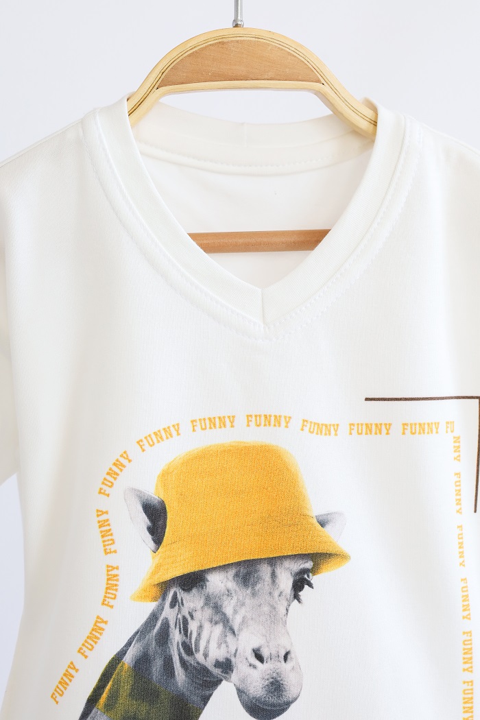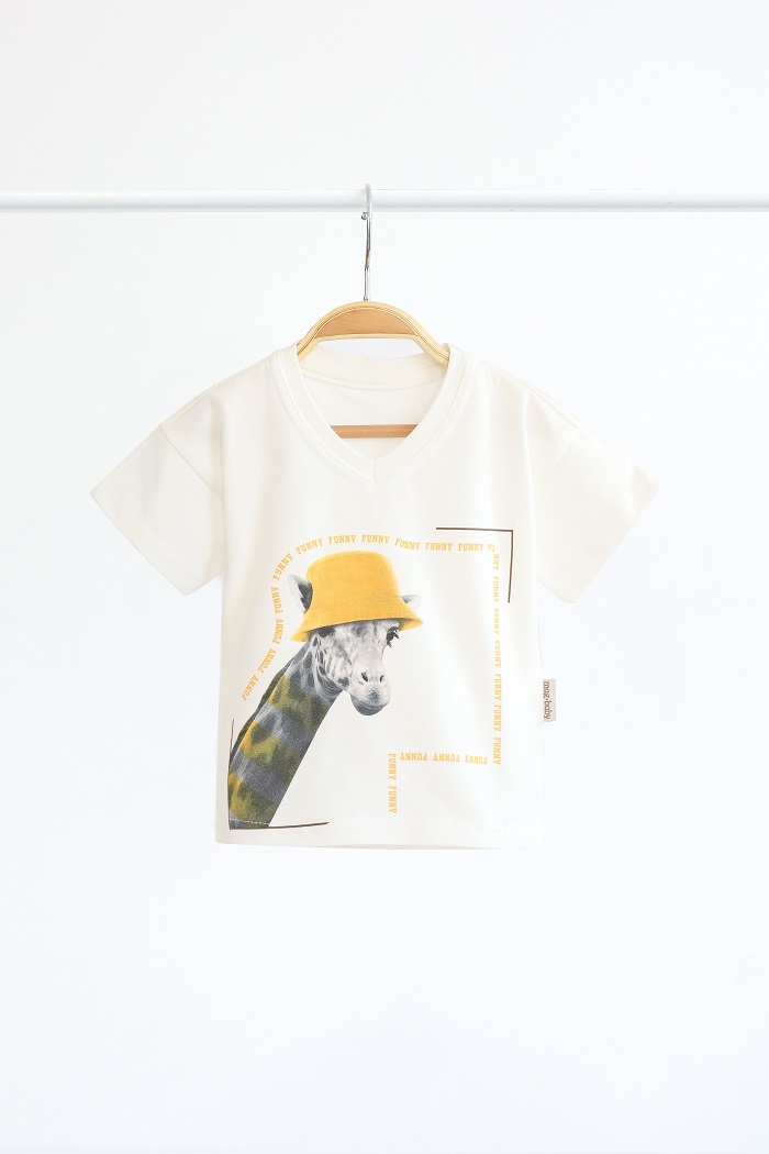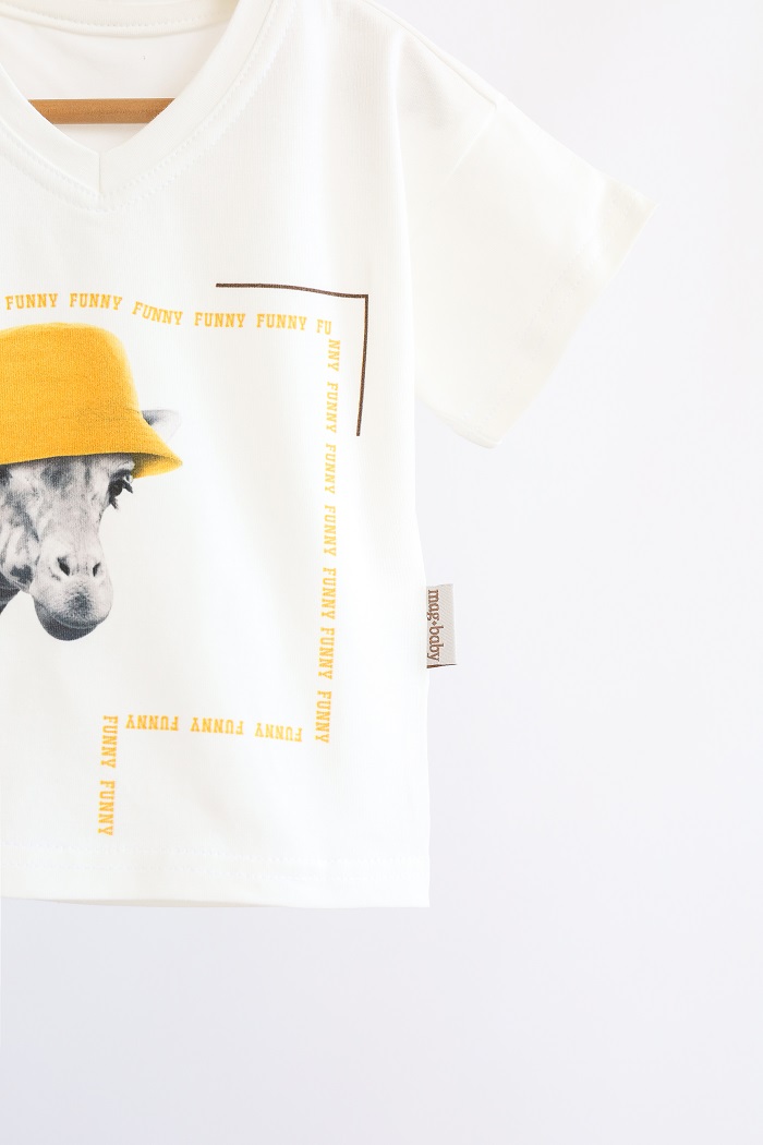 Через V-подібну горловину легко вдягнути футболку на малюка, щоб вона не застрягала на вухах. І додає стильної родзиночки!
