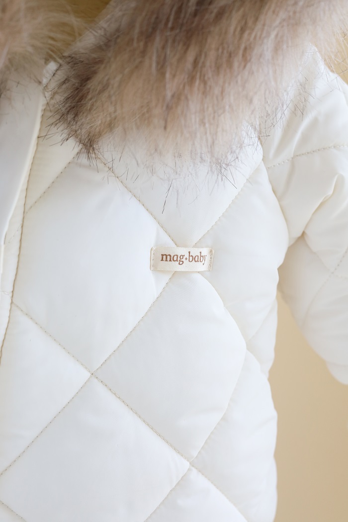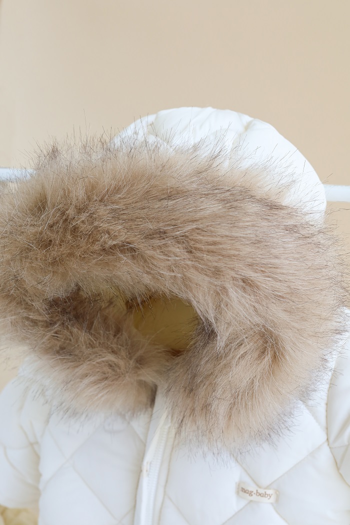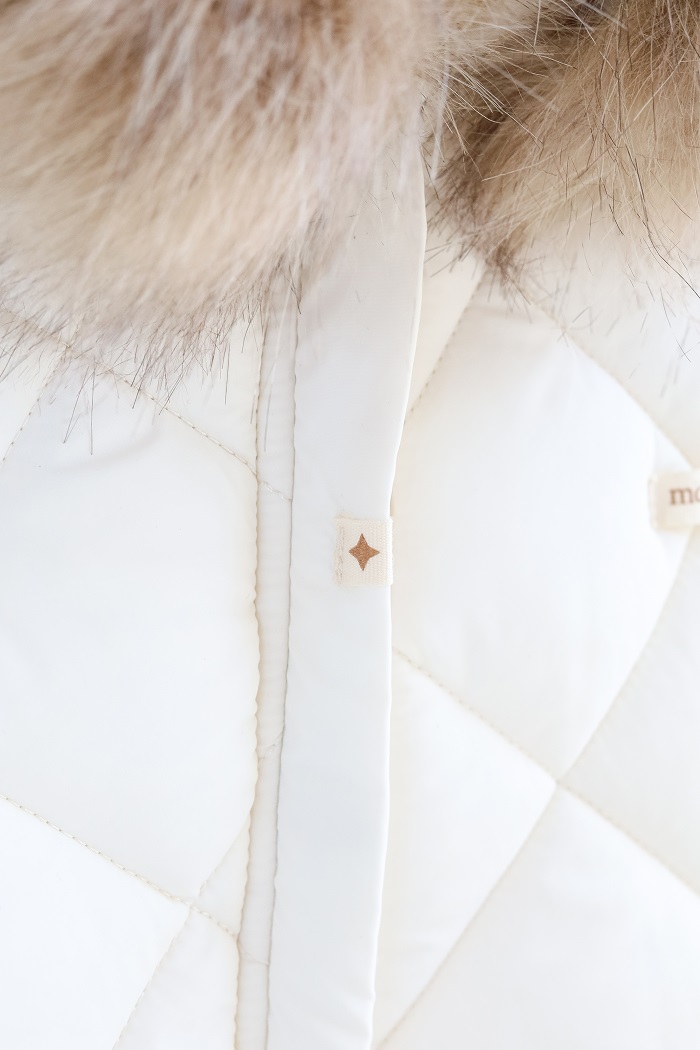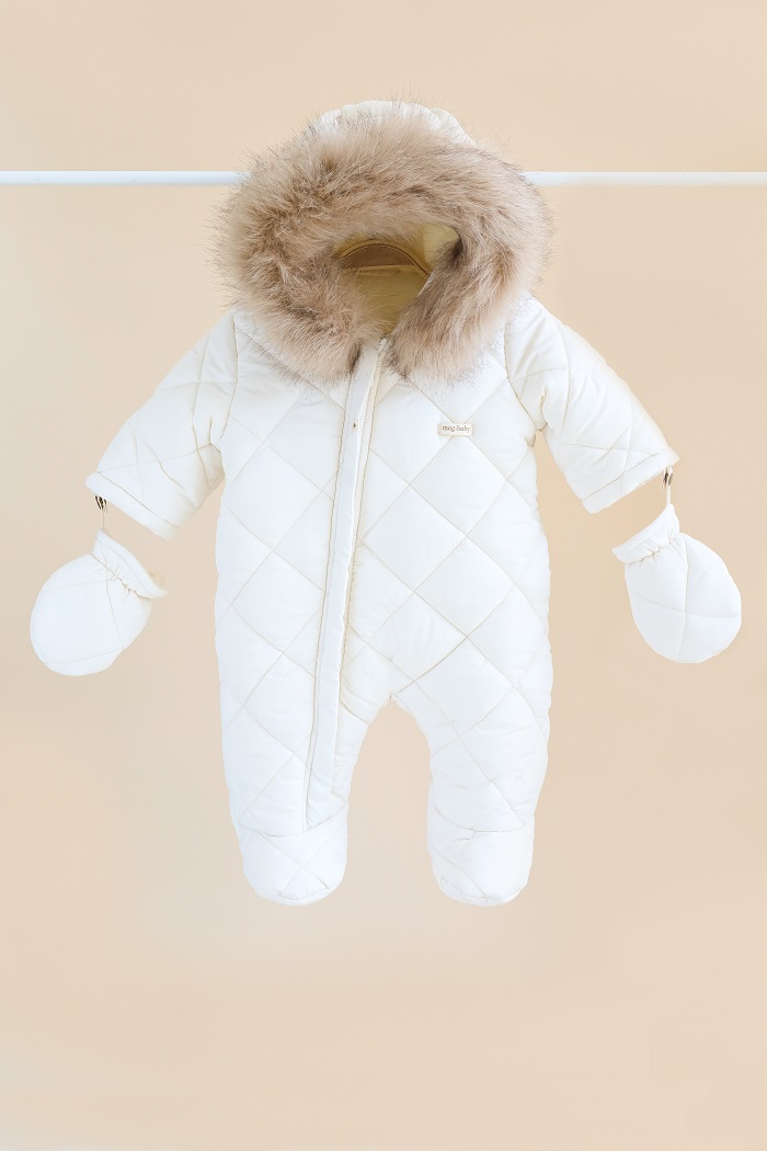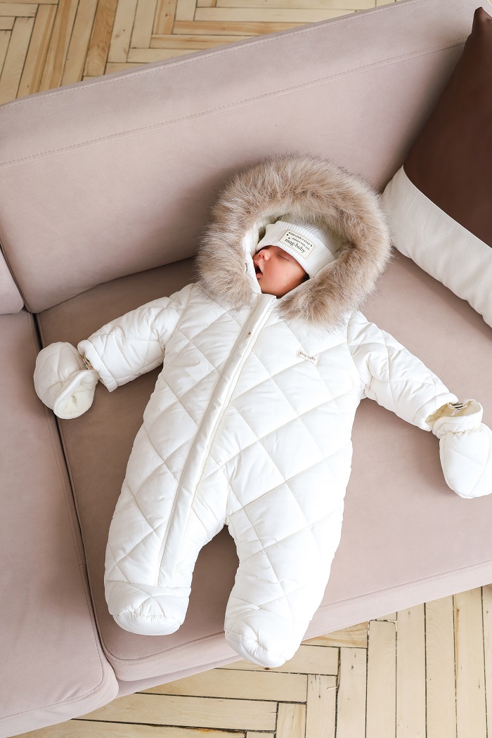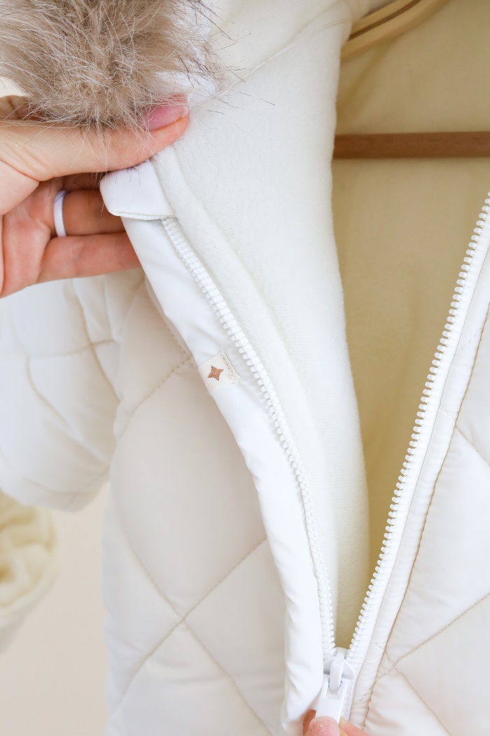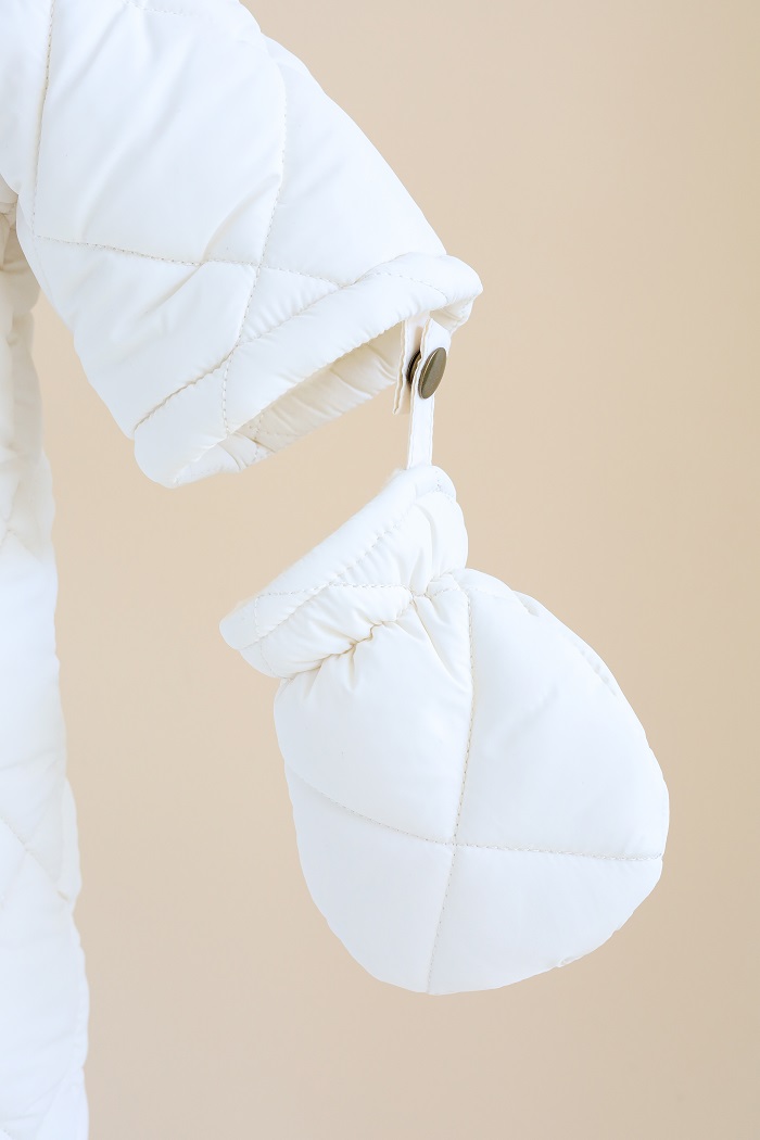 Одягається дуже просто, за допомогою діагональної блискавки, яка доходить до ніжки малюка. А ще зверніть увагу на стильний стьобаний дизайн у ромбики, який у трендах вже не один сезон.