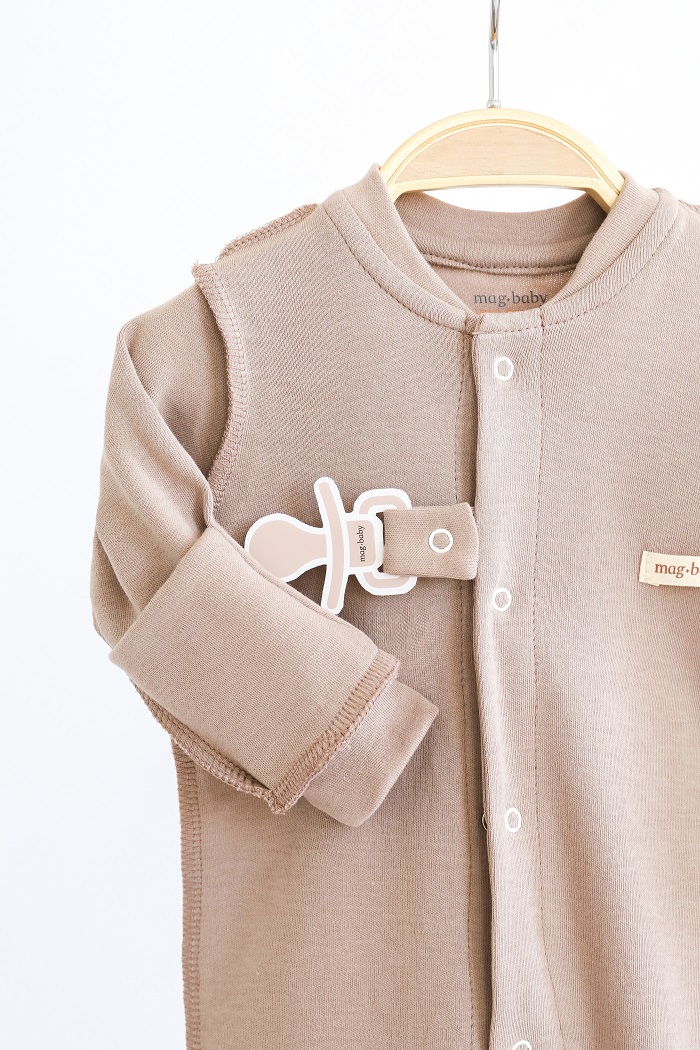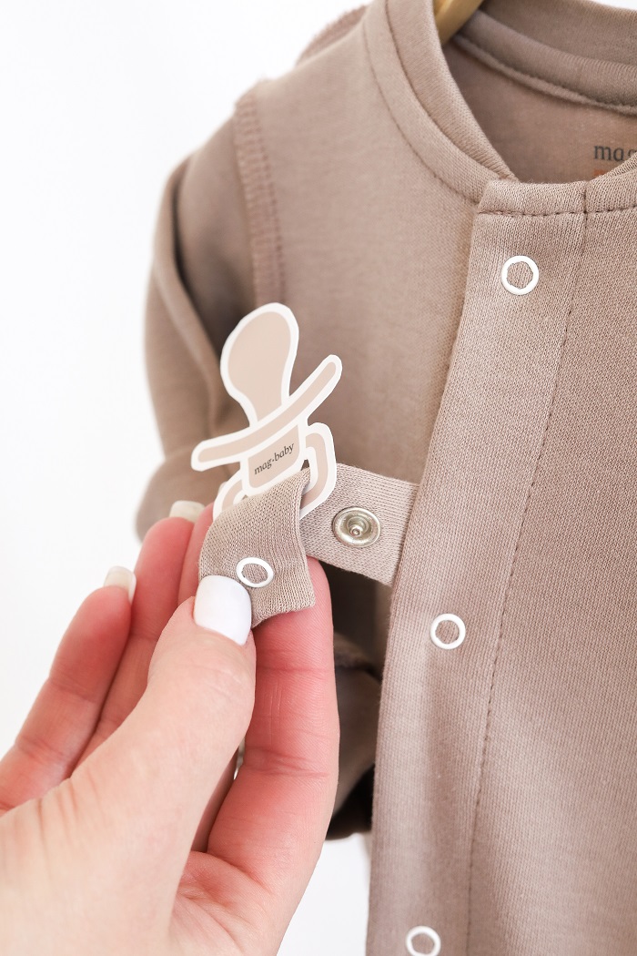 Є відворотні царапки та тримач для пустушки або іграшки, який зручно використовувати замість пластикових прищіпок.