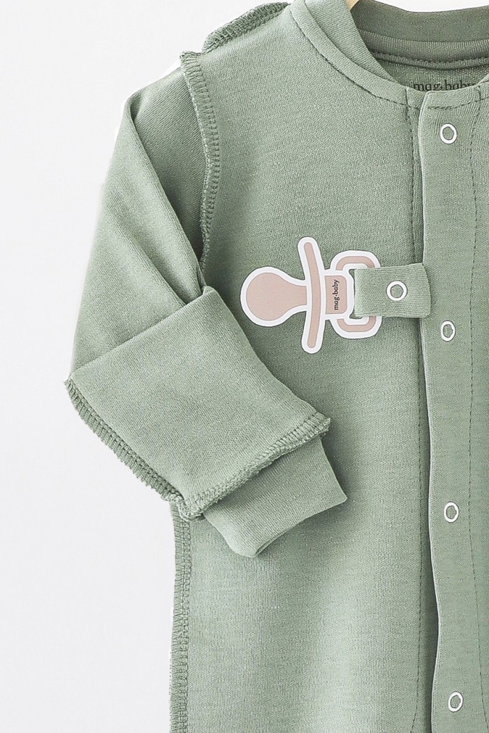 Є відворотні царапки та тримач для пустушки або іграшки, який зручно використовувати замість пластикових прищіпок.