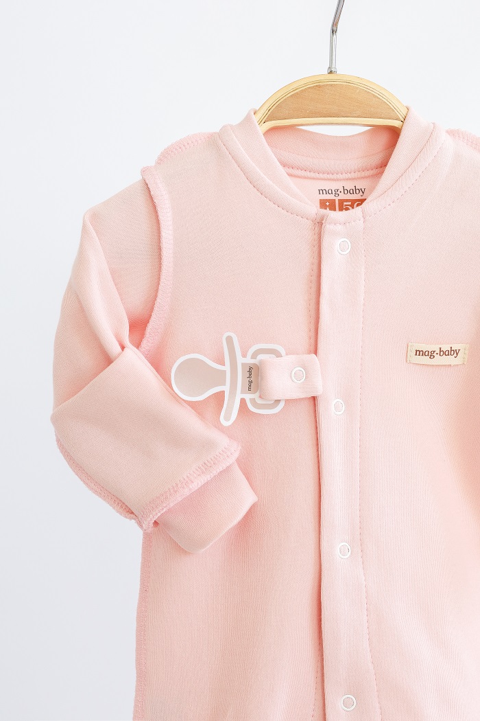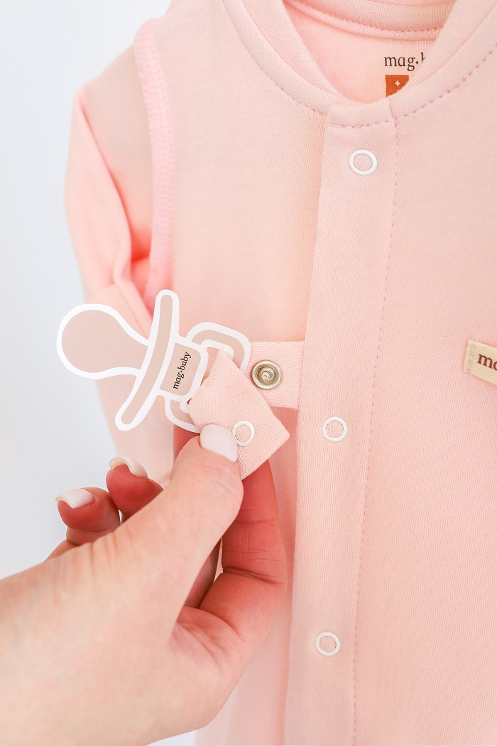 Є відворотні царапки та тримач для пустушки або іграшки, який зручно використовувати замість пластикових прищіпок.