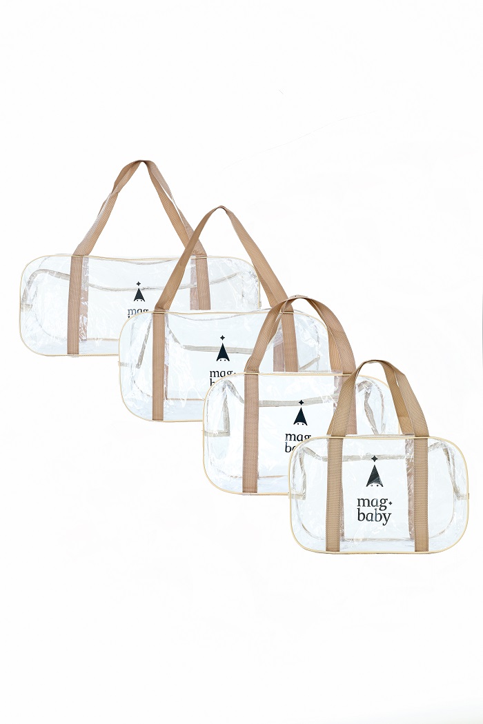 Сумки виготовлені з якісного ПВХ. Завдяки прозорим стінкам ви одразу бачите, що всередині, а зручні ручки та блискавка роблять їх надійними супутниками у пологовий.