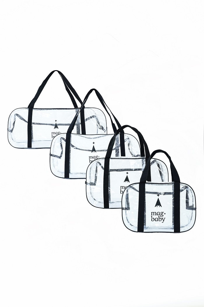 Сумки виготовлені з якісного ПВХ. Завдяки прозорим стінкам ви одразу бачите, що всередині, а зручні ручки та блискавка роблять їх надійними супутниками у пологовий.