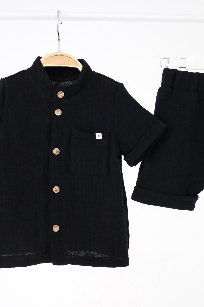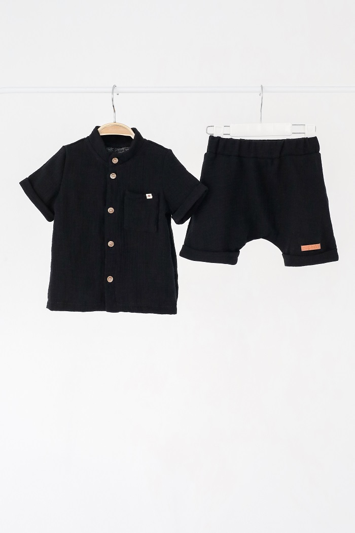 У комплект входять шортики і сорочка на гудзиках, які ви так само можете носити окремо. За рахунок того, що вони однотонні, і шорти і сорочку можна поєднувати з практично будь-якими речами в гардеробі.