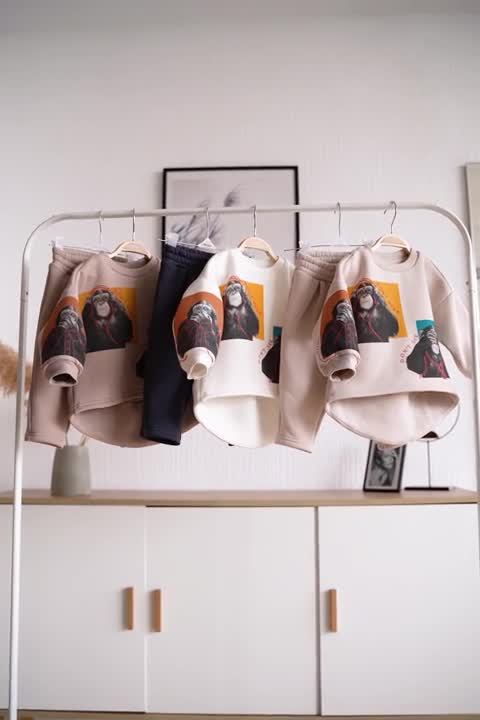 Базовий костюмчик з мавпочками зігріє малюка у міжсезоння та взимку. Зручно носити як повноцінний лук, а в прохолодні дні — під комбінезон. Затишна та сильна кофта нестандартного крою. Подовжена спинка ніби “видута” на попі об’ємом і звужується донизу, подібно до форми груші. Повна свобода рухів — малюку зручно гратися, бігати, лазити, а поперек не буде голим. Штани з трикотажу з защипами спереду. Зручні, стильні та сучасні.
