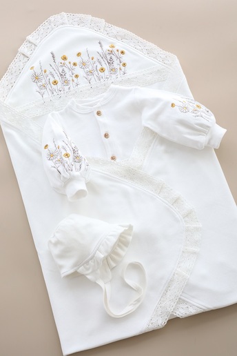Усі речі у ньому пошиті швами назовні і, у поєднанні з ну дуже мʼякеньким трикотажем, створять відчуття хмаринки для вашого малюка з перших днів його життя.