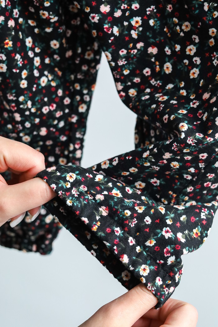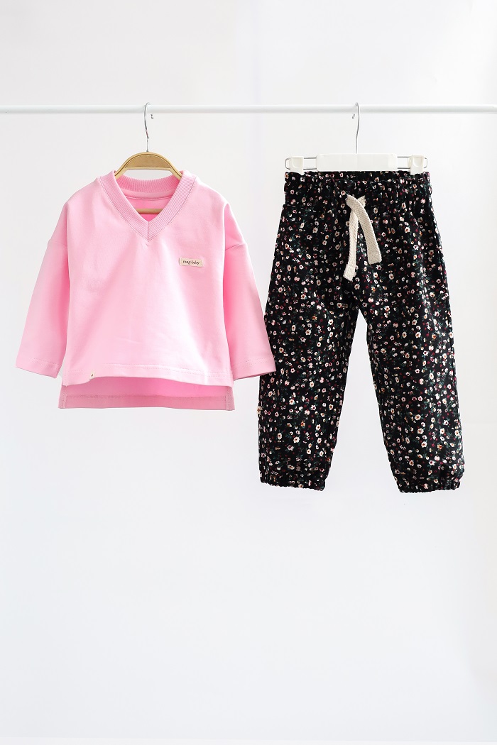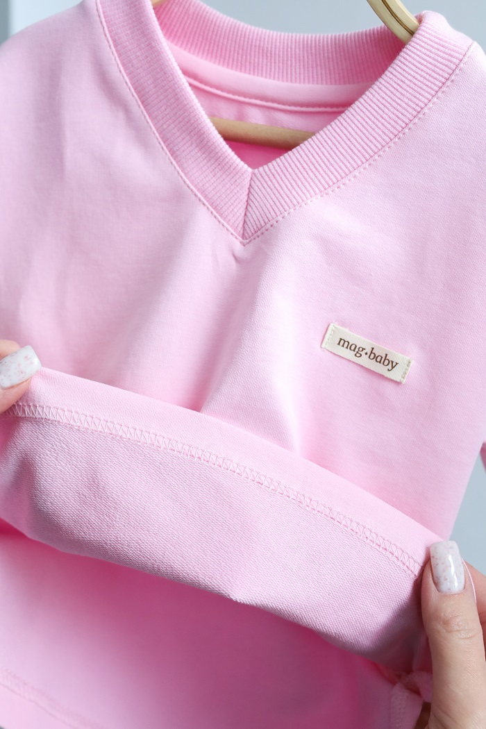 Кофта з довгим рукавом та V-подібним вирізом виготовлена з бавовняного трикотажу двунитки з петлею, а штани — зі 100% бавовни з начосом. Тканина м'яка та приємна до тіла, ніби пухкі хмаринки. Підходить для чутливої шкіри — гіпоалергенна та дає змогу шкірі дихати. Еластичний пояс штанів не тугий і не тиснутиме на животик.