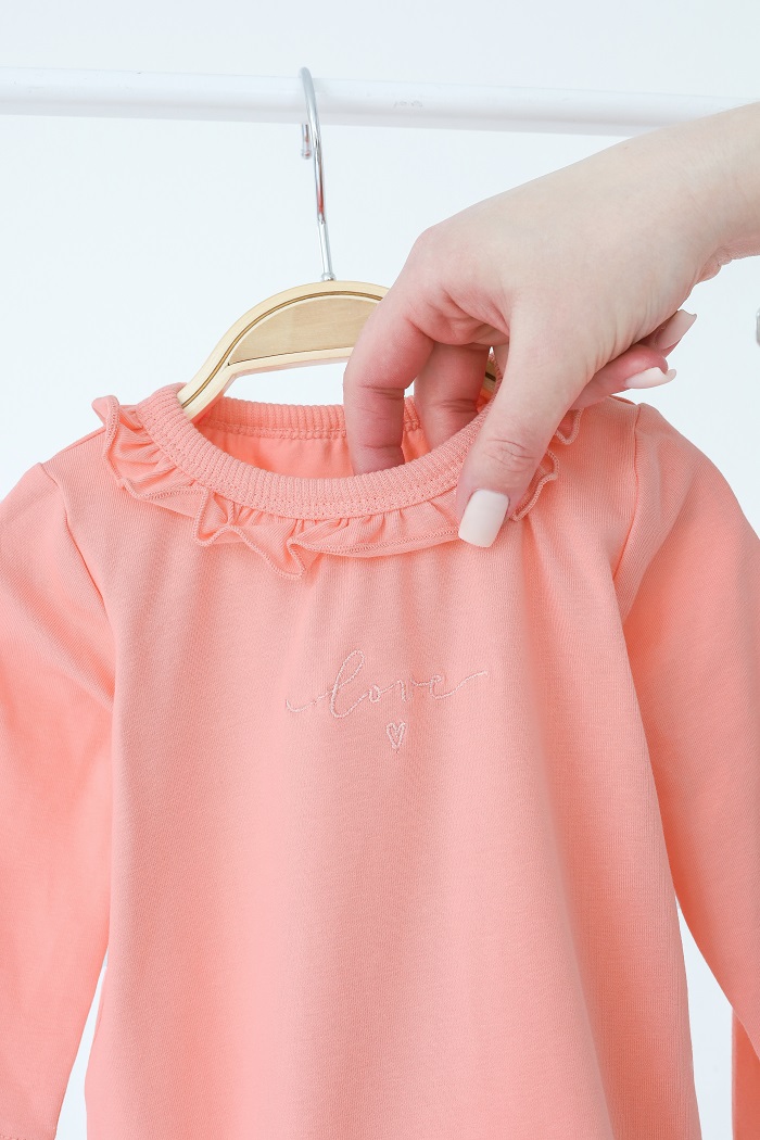 Рюші на комірці й манжетах додають образу витонченості й тендітності. М’яка бавовняна тканина лагідно торкається шкіри, даруючи комфорт протягом усієї ночі. Легка вишивка з написом " love" — як оберіг любові та тепла для кожної маленької дівчинки.