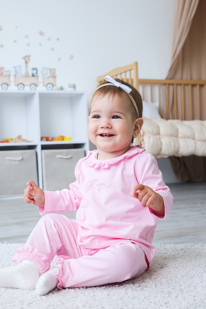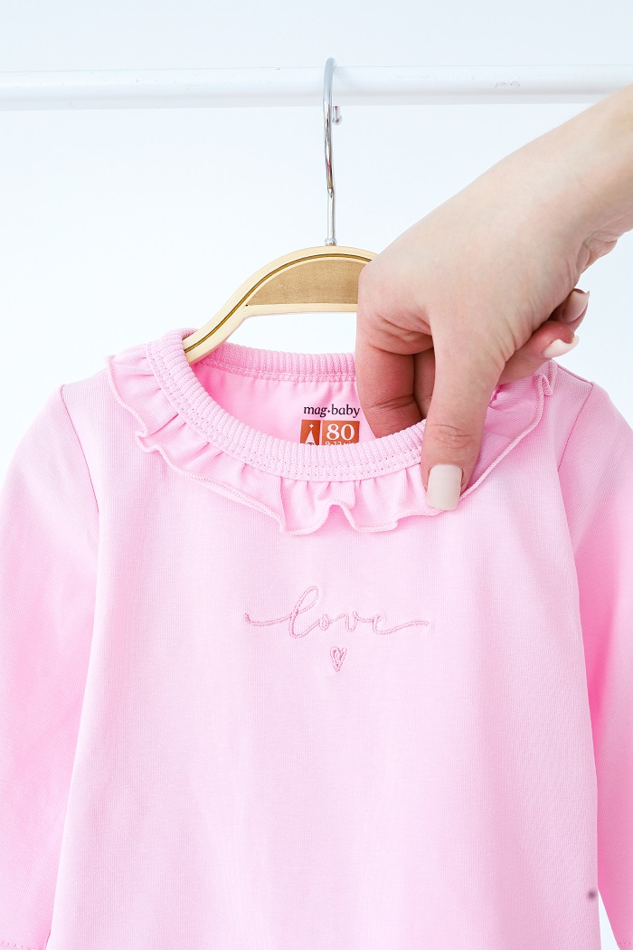 Рюші на комірці й манжетах додають образу витонченості й тендітності. М’яка бавовняна тканина лагідно торкається шкіри, даруючи комфорт протягом усієї ночі. Легка вишивка з написом " love" — як оберіг любові та тепла для кожної маленької дівчинки.