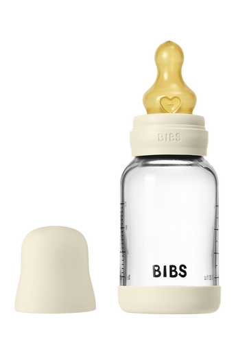 Пляшечка BIBS об’ємом 150 мл із соскою з натурального каучуку, з антиколіковою функцією.