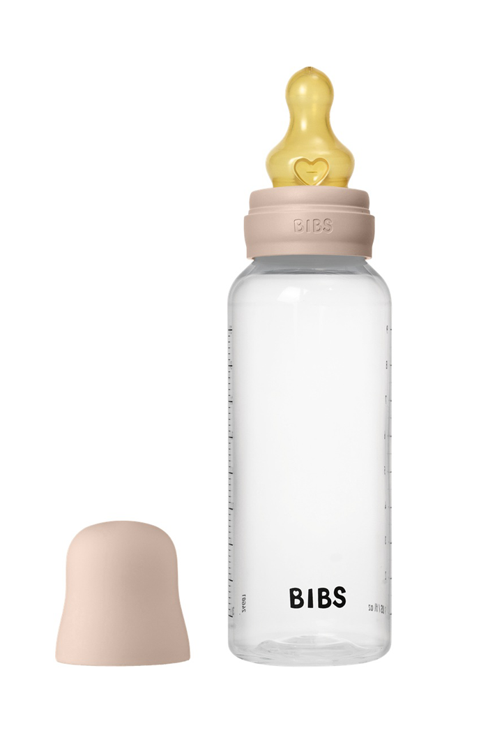 Пляшечка BIBS об’ємом 270 мл із соскою з каучукового латексу, з антиколіковою функцією.