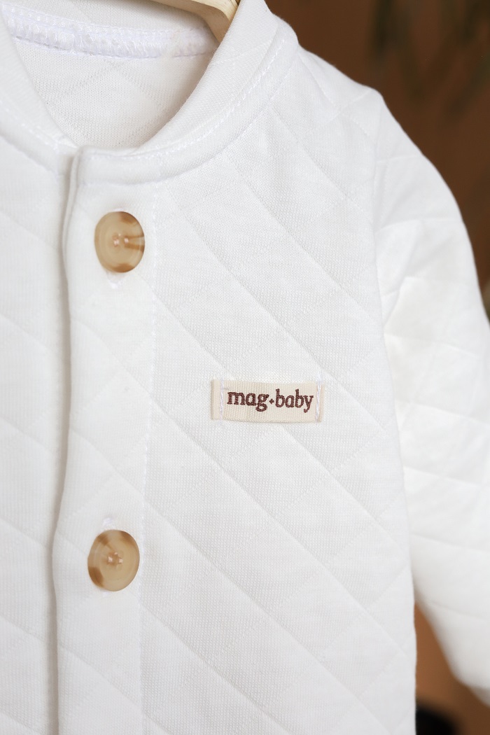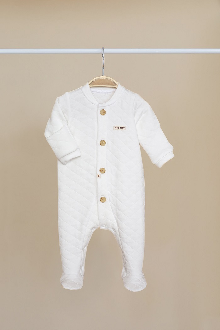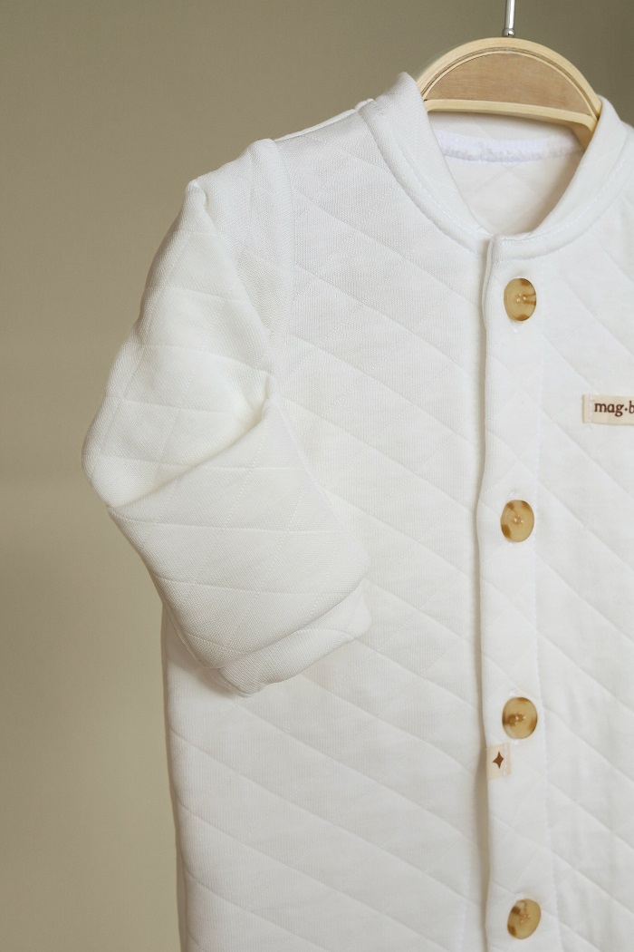 Конечно вы поняли к чему я веду. К тому, что этот вот человечек в себе всё это и сочетает. Человечек имеет застежку в две ножки, значит удобно. Выполнен из утепленной ткани - два слоя трикотажа простеганного тоненьким слоем синтепона, значит теплый. И так как трикотаж хлопковый с лица и изнанки, значит натуральный. Красивым его делает текстура ткани, нашивка и пуговицы. На рукавчиках в размере 62, 68 встроены царапки.