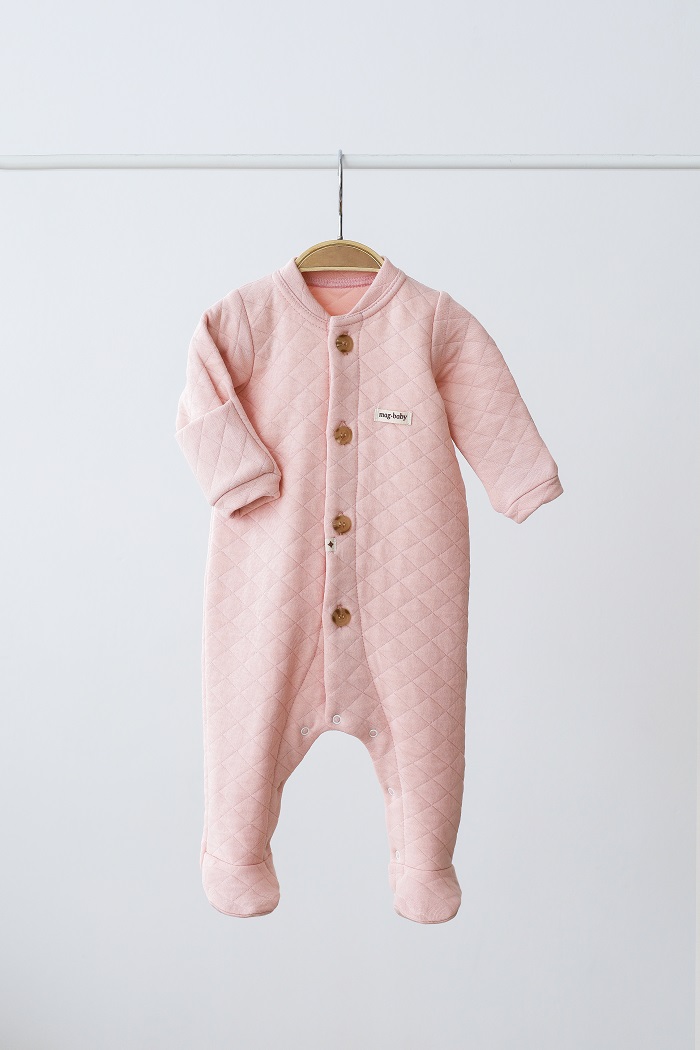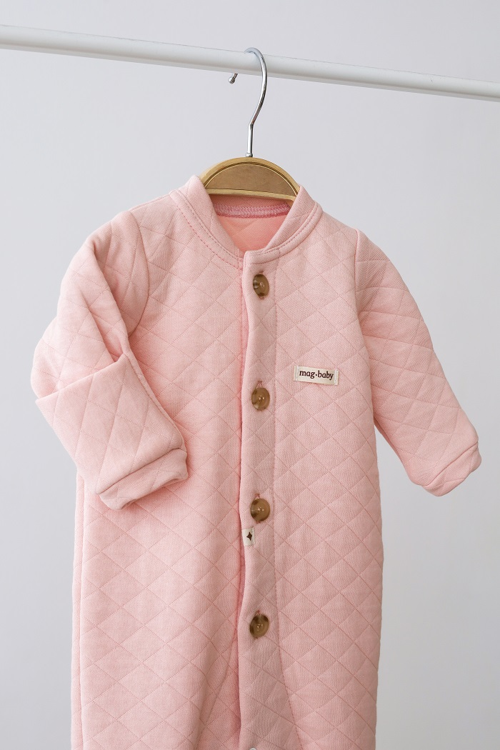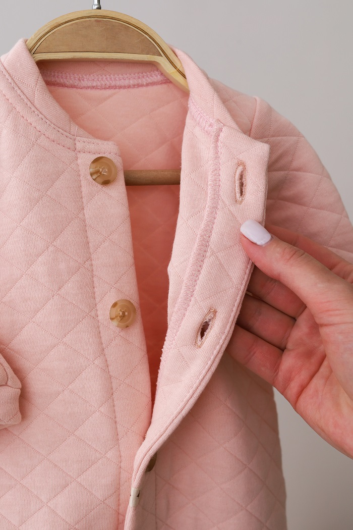 Конечно вы поняли к чему я веду. К тому, что этот вот человечек в себе всё это и сочетает. Человечек имеет застежку в две ножки, значит удобно. Выполнен из ткани «Капитоне» - два слоя трикотажа простеганного тоненьким слоем синтепона, значит теплый. И так как трикотаж хлопковый с лица и изнанки, значит натуральный. Красивым его делает текстура ткани, нашивка и пуговицы. На рукавчиках в размере 62, 68 встроены царапки.