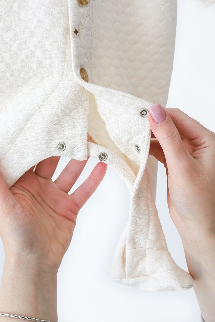 Конечно вы поняли к чему я веду. К тому, что этот вот человечек в себе всё это и сочетает. Человечек имеет застежку в две ножки, значит удобно. Выполнен из утепленной ткани - два слоя трикотажа простеганного тоненьким слоем синтепона, значит теплый. И так как трикотаж хлопковый с лица и изнанки, значит натуральный.