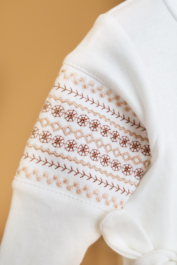 Рукава украшены настоящей украинской вышивкой, которая изнутри обработана дополнительным слоем ткани. Зачем? Чтобы не раздражать лишними швами нежную кожу малыша.