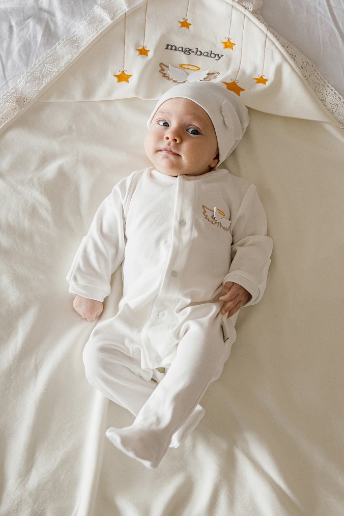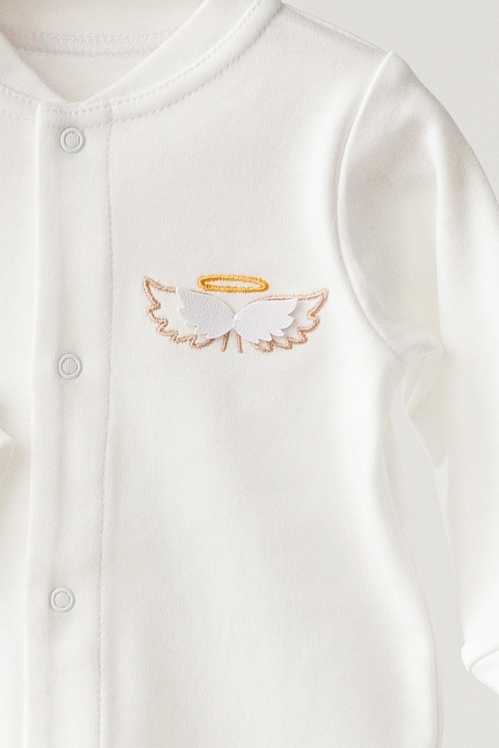 В комплект входит: человечек и шапочка. Трикотажный комбинезон имеет вышивку и 3-D отделку в виде крыльев из эко-кожи. Застегивается на кнопочки европейского стандарта, не содержащие никеля в своем составе. А значит, не вызывают аллергии у малыша.