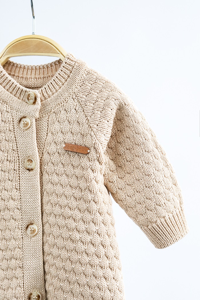 Мы специально сделали удлиненные манжеты, чтобы их можно было легко подвернуть в соответствии с ростом малыша и носить человечек дольше. Застегивается на пуговки и выглядит очень нежно.