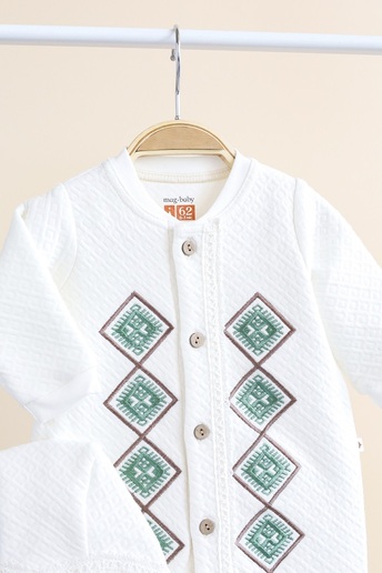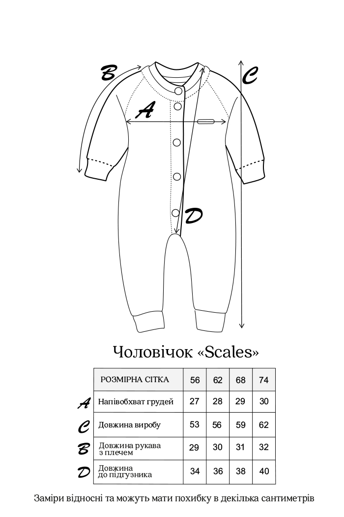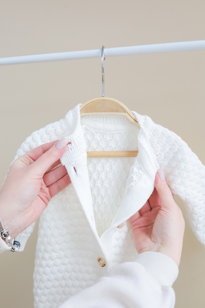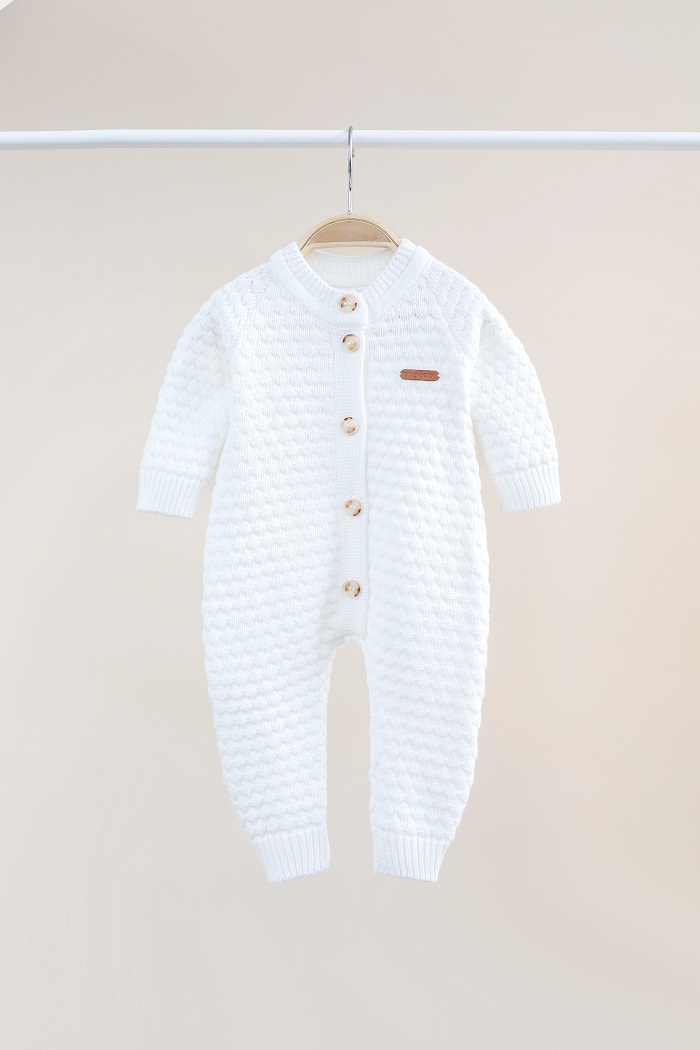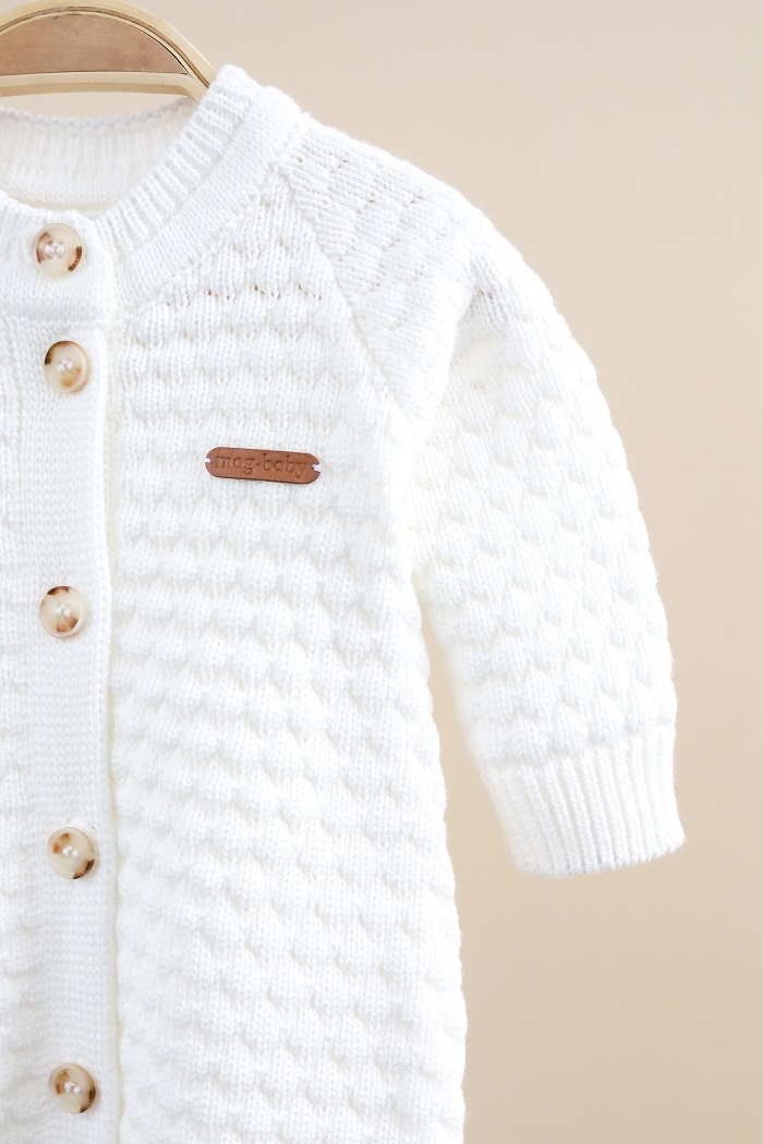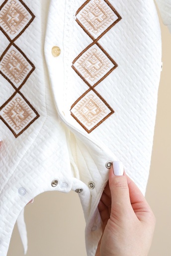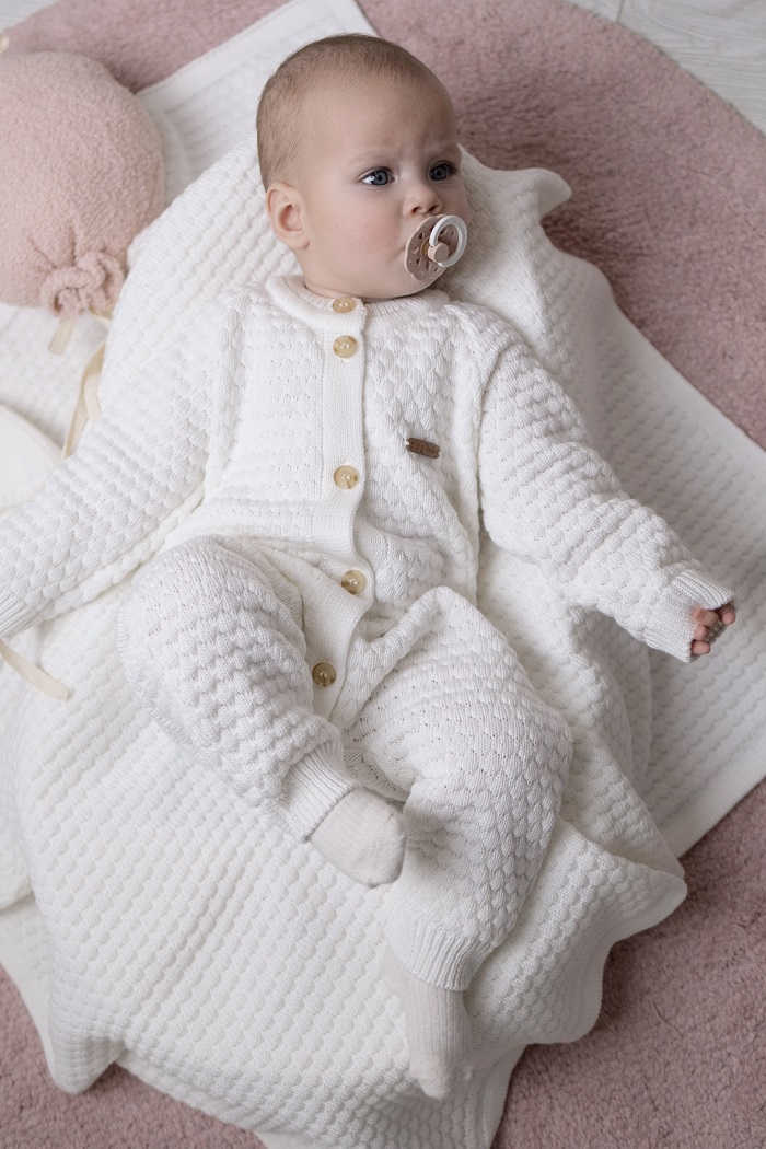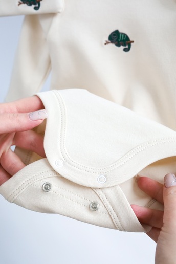 Мы специально сделали удлиненные манжеты, чтобы их можно было легко подвернуть в соответствии с ростом малыша и носить человечек дольше. Застегивается на пуговки и выглядит очень нежно.