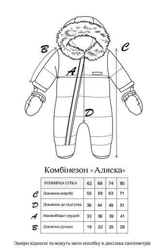 - Выбираем детские зимние комбинезоны украинского производителя в соответствии с размерной сеткой. Учитывая рост ребенка, прибавить 10 сантиметров. Обращаем внимание на крой изделия.