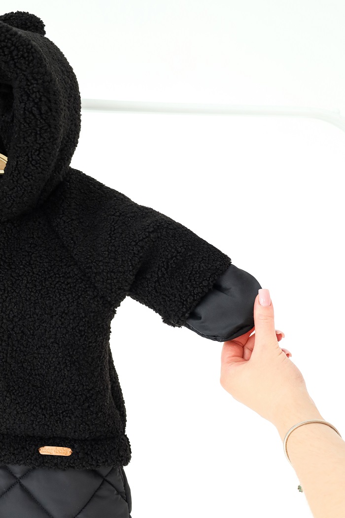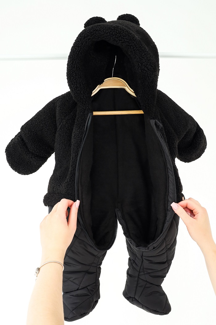 Верхняя часть выполнена из мягкого искусственного меха тедди, очень приятного на ощупь. Низ — из практичной плащевки, надежно защищающей от снега или влаги. А внутри уютный тёплый флис и подкладочная ткань.