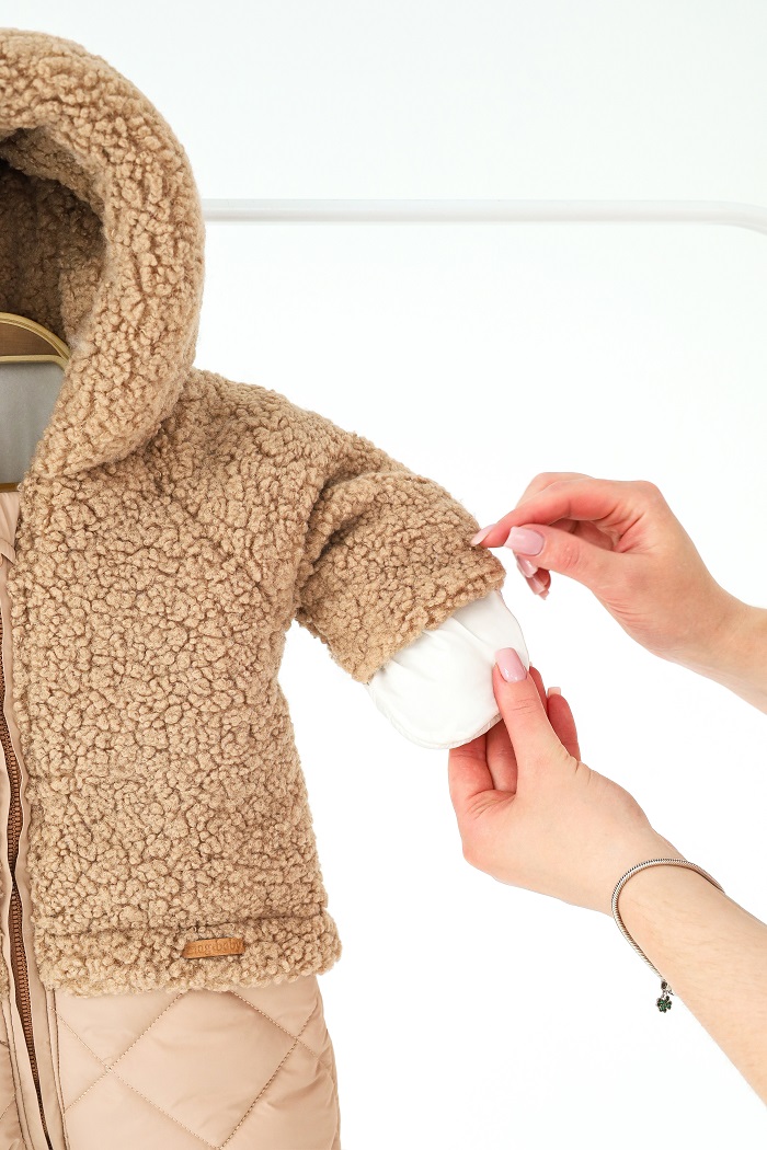 Верхняя часть выполнена из мягкого искусственного меха тедди, очень приятного на ощупь. Низ — из практичной плащевки, надежно защищающей от снега или влаги. А внутри уютный тёплый флис и подкладочная ткань.