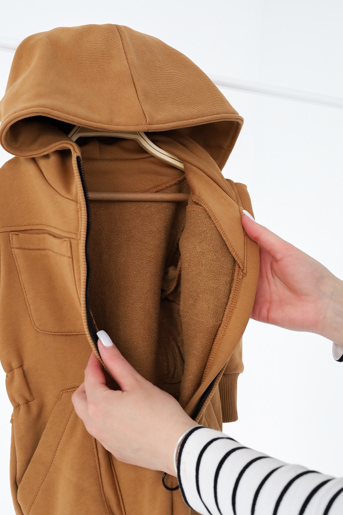 Пошит из очень качественной тринитки с петельчатой изнанкой, без начеса. А это значит, что он не будет кашлатиться. Имеет классные детали в виде карманов, резиночек по бокам, молнии. Оснащен глубоким капюшоном.