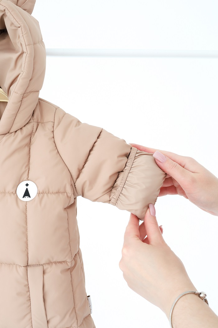 Сверху комбинезона пошит из плащевки, стеганной стильными прямоугольниками. Материал плотный, защищает от ветра и влаги. Внутри – мягкий флис и подкладочная ткань.