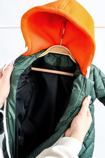 А под молниями, на горлышке мы сделали дополнительный слой, закрывающий шею и грудь малыша, который застегивается на кнопку.
