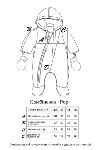 Имеет глубокий капюшон. Рукавички на кнопках в комплекте.