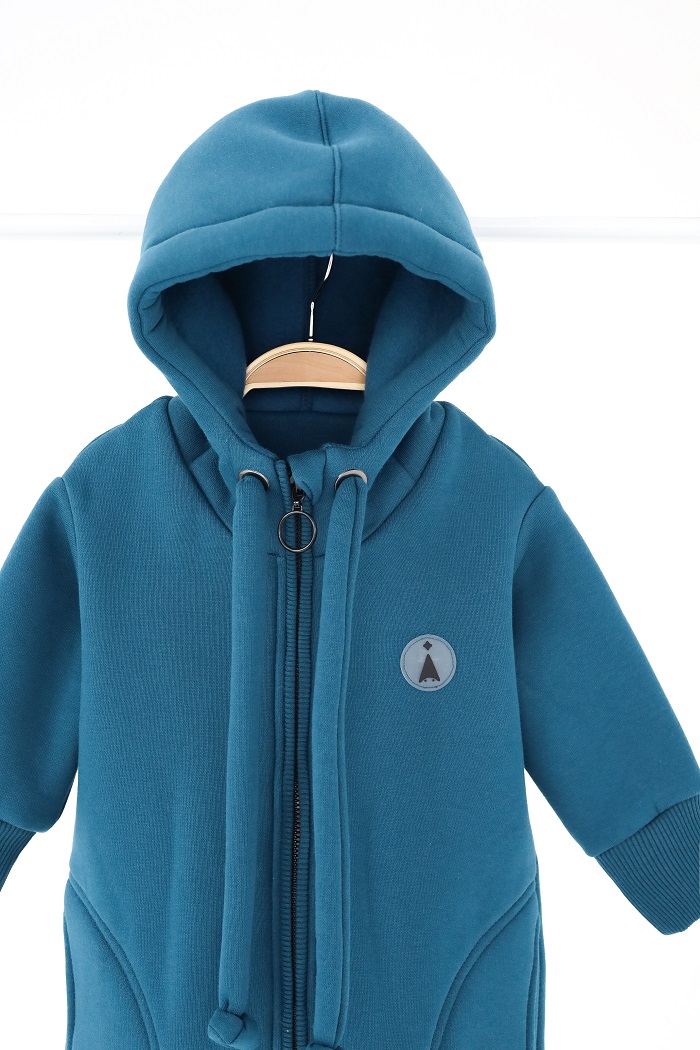 Функционально капюшон у комбинезона утягивается, на спине есть резиночка.