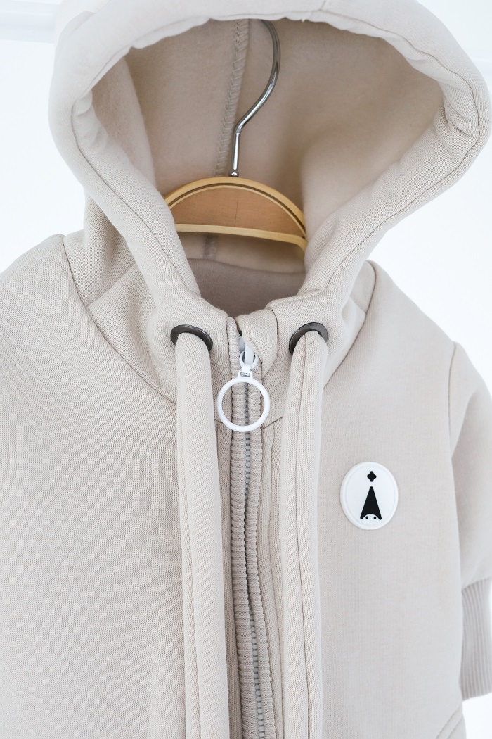 Функционально капюшон у комбинезона утягивается, на спине есть резиночка.