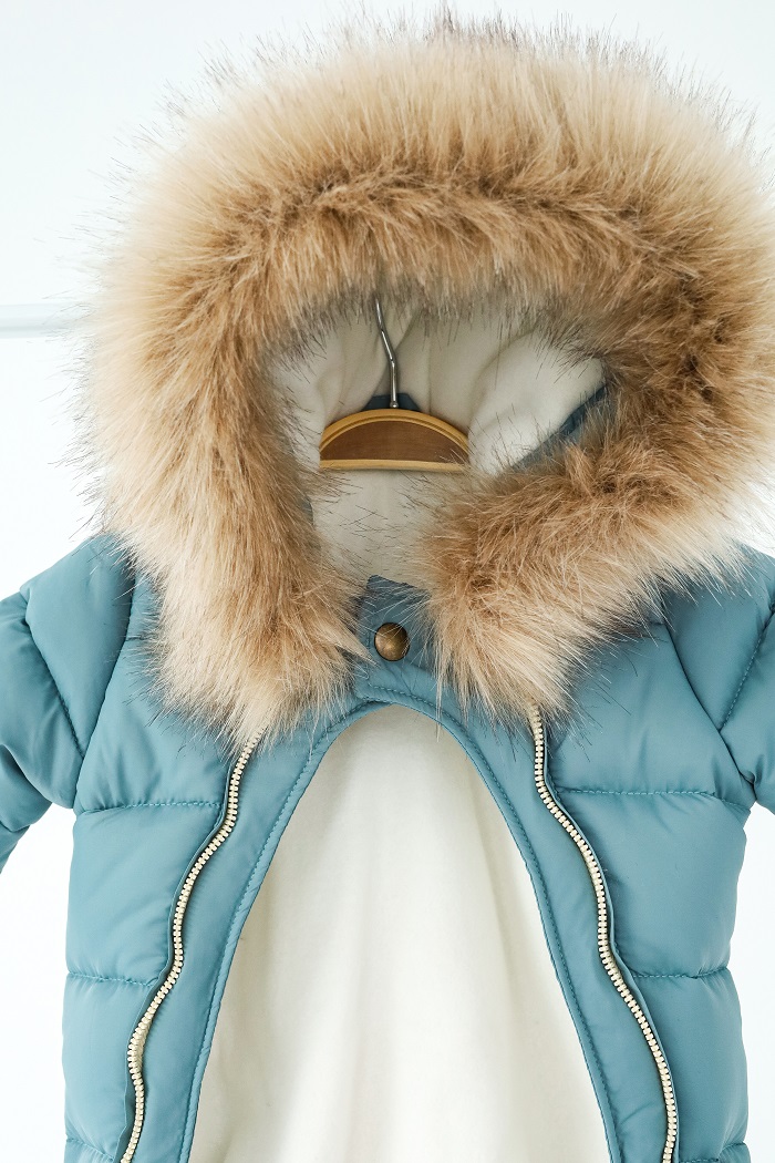 Капюшон украшен пушистой опушкой из искусственного меха, которую можно отстегнуть. И без меха комбинезон остается аккуратным – все кнопки спрятаны под планкой.