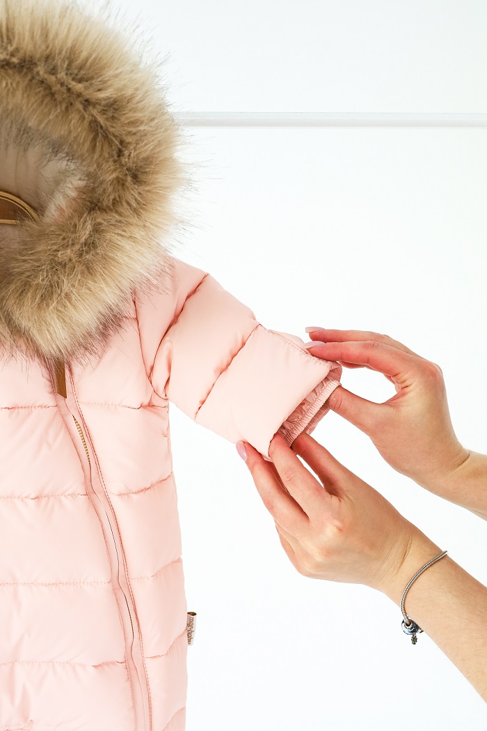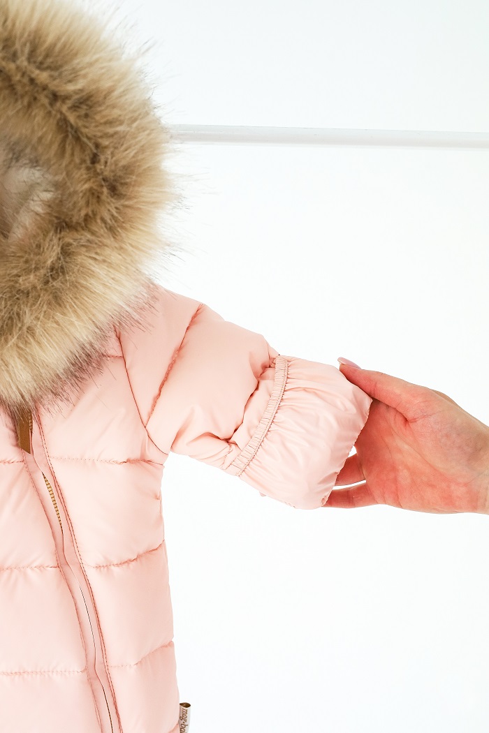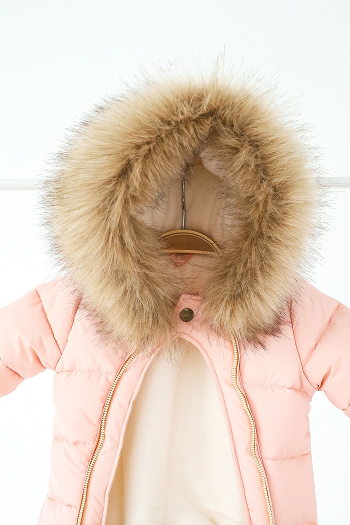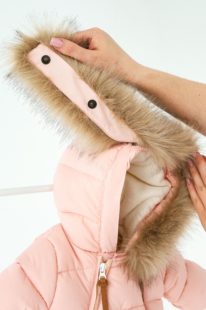 Капюшон украшен пушистой опушкой из искусственного меха, которую можно отстегнуть. И без меха комбинезон остается аккуратным – все кнопки спрятаны под планкой.