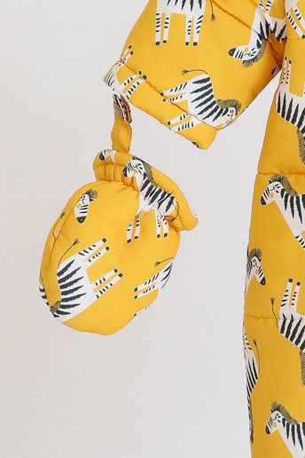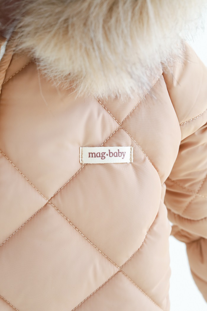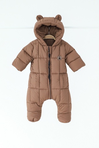 Одевается очень просто, с помощью диагональной молнии, доходящей до ножки малыша. А еще обратите внимание на стильный стеганый дизайн в ромбик, который в трендах уже не один сезон.