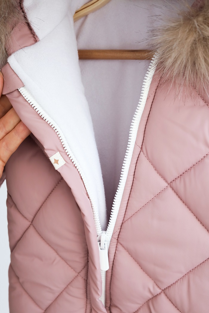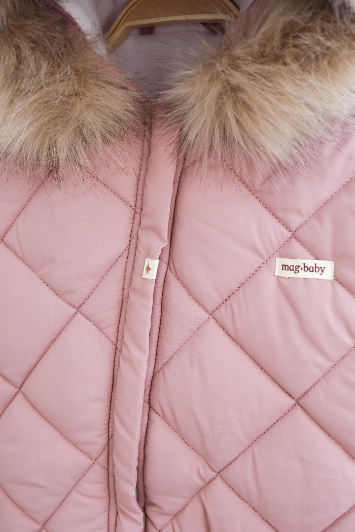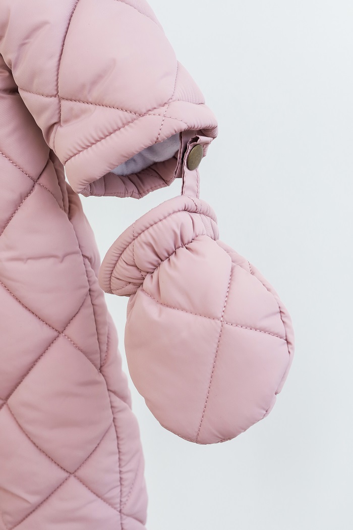 Одевается очень просто, с помощью диагональной молнии, доходящей до ножки малыша. А еще обратите внимание на стильный стеганый дизайн в ромбик, который в трендах уже не один сезон.