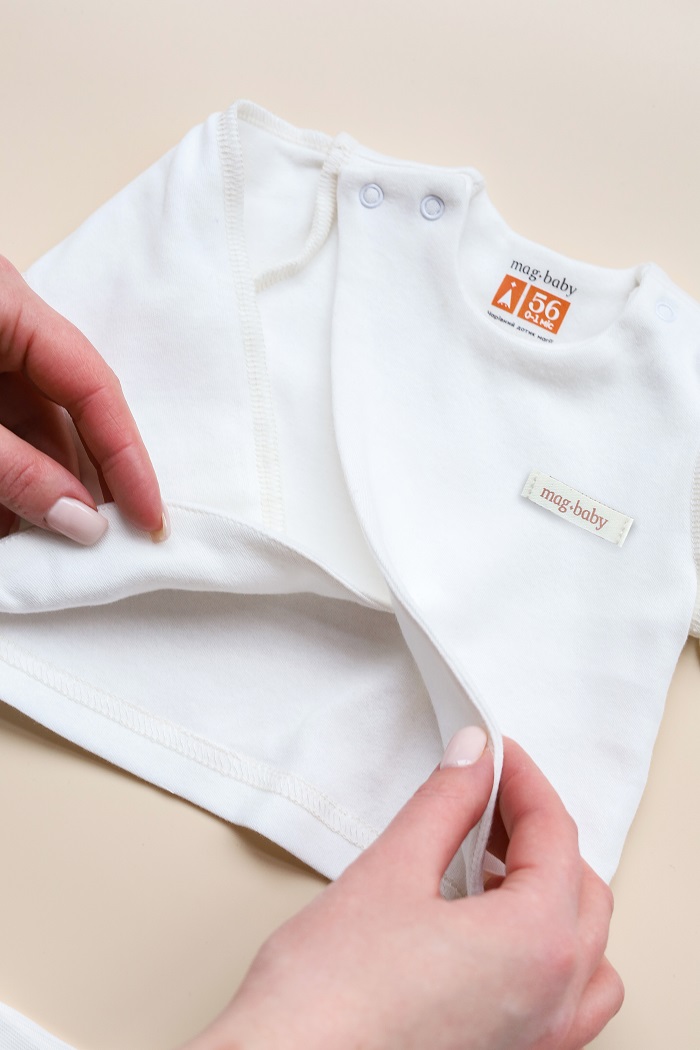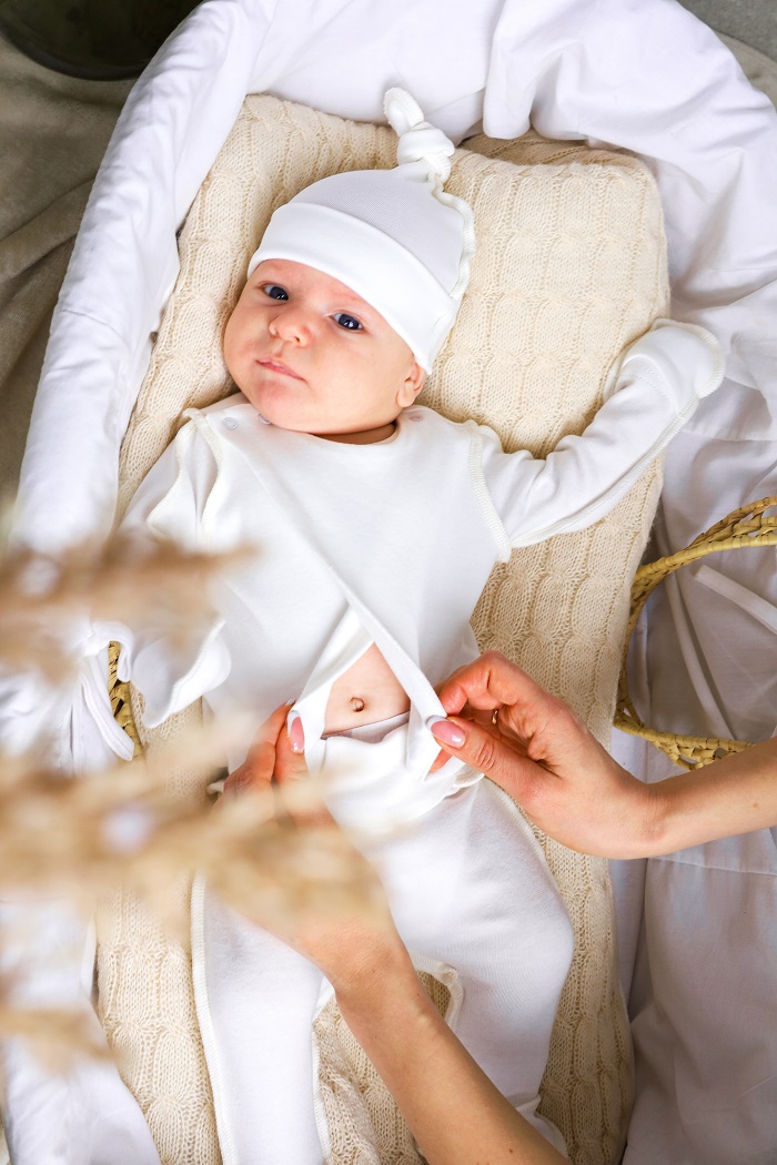 Имеет конструктивно разработанный легкий доступ к пупочной ранке. Это означает, что ткань не будет мешать, а ранка будет контактировать с воздухом и быстрее заживет. Когда пупочек отпадет, вещи можно еще носить как обычные.