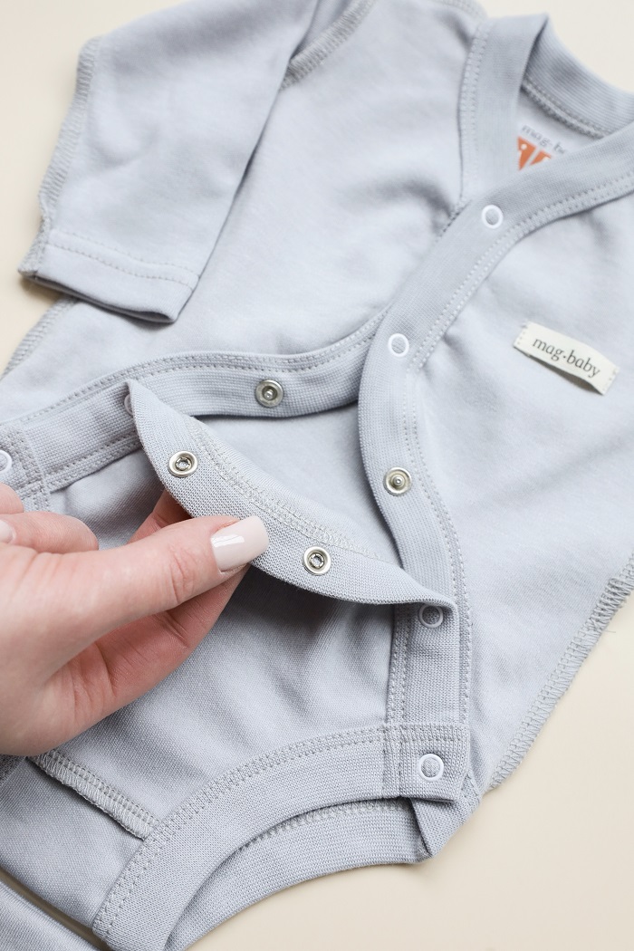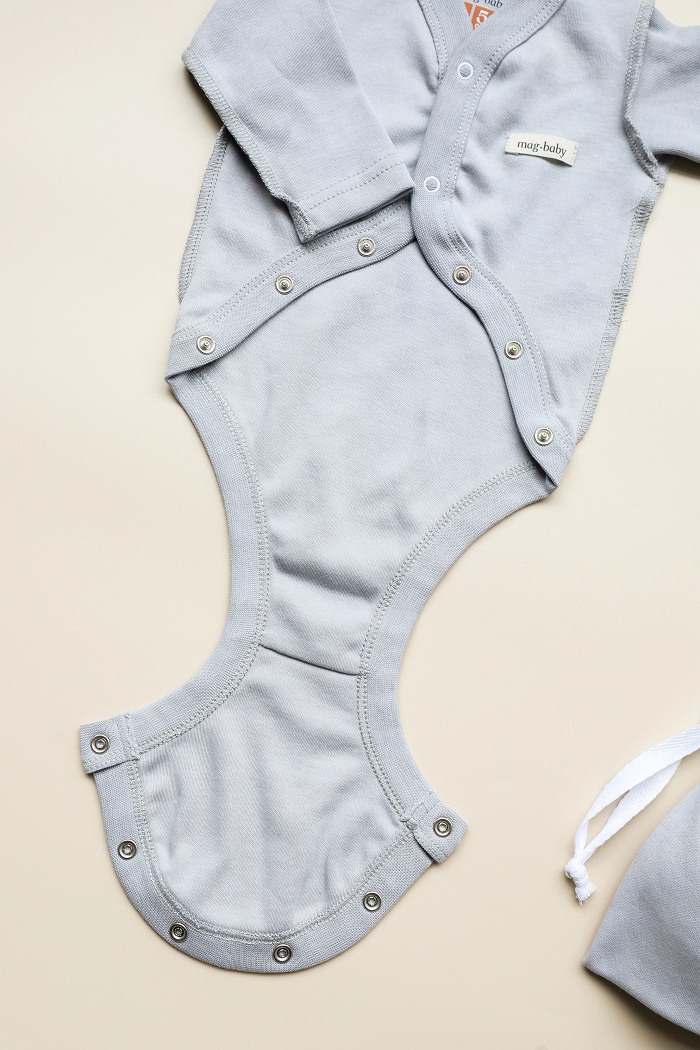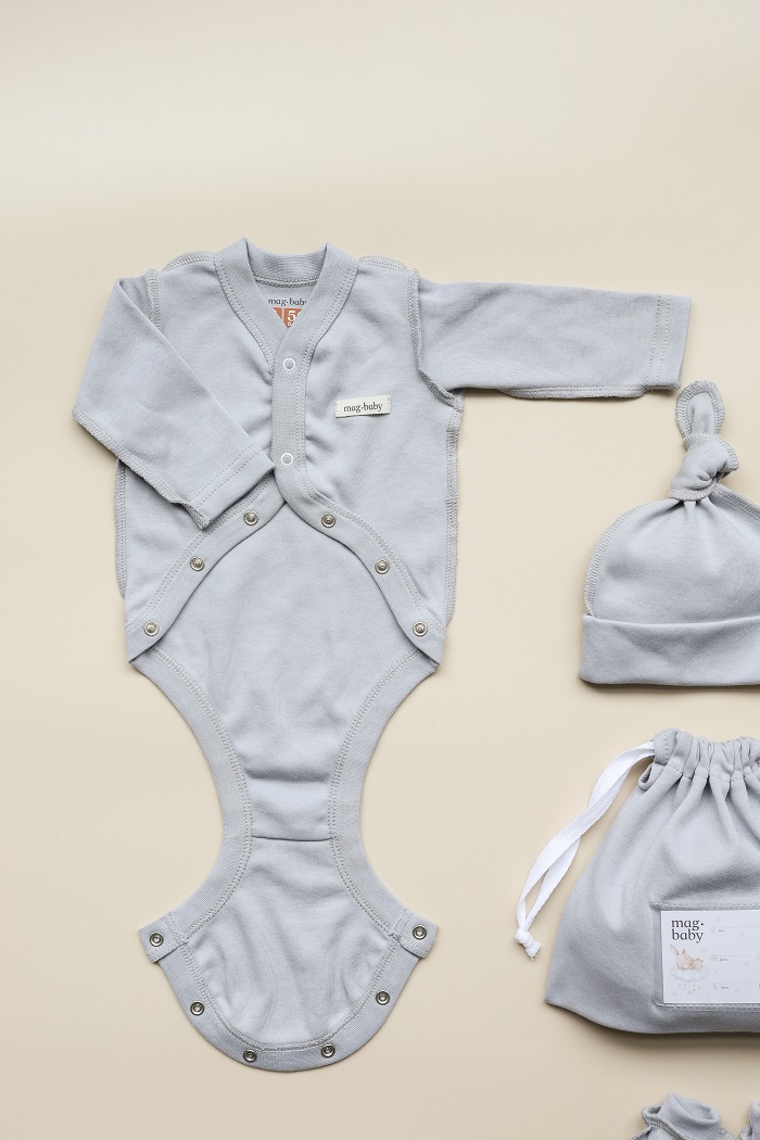 Имеет конструктивно разработанный легкий доступ к пупочной ранке. Это означает, что ткань не будет мешать, а ранка будет контактировать с воздухом и быстрее заживет. Когда пупочек отпадет, вещи можно еще носить как обычные.