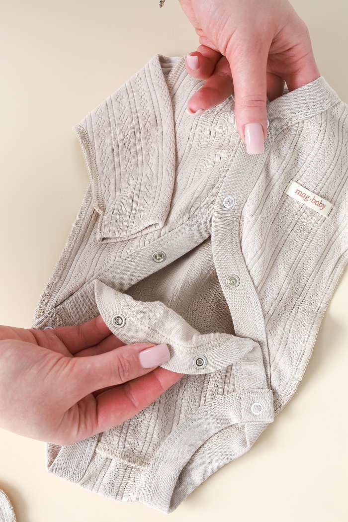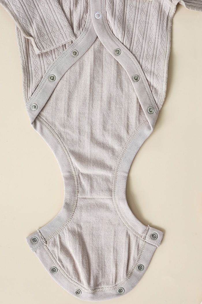 Имеет конструктивно разработанный легкий доступ к пупочной ранке. Это означает, что ткань не будет мешать, а ранка будет контактировать с воздухом и быстрее заживет. Когда пупочек отпадет, вещи можно еще носить как обычные.