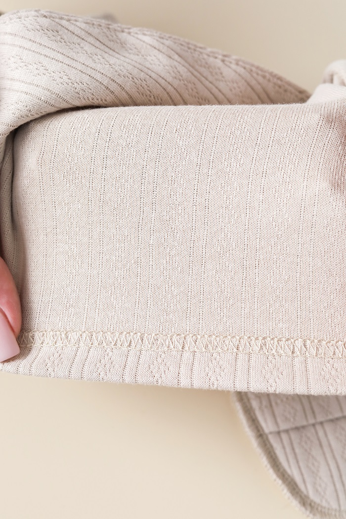 Пошит из 100% хлопка — интерлочного трикотажа с перфорацией сверху. Натуральная ткань не вызывает аллергии, позволяет коже дышать и не парит.