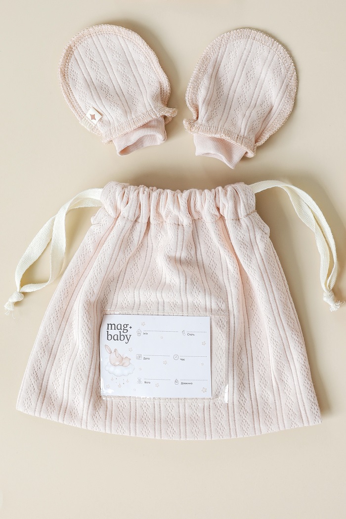 - Мешочек для хранения первой одежды с биркой, где можно вписать дату рождения, рост, вес, имя малыша.