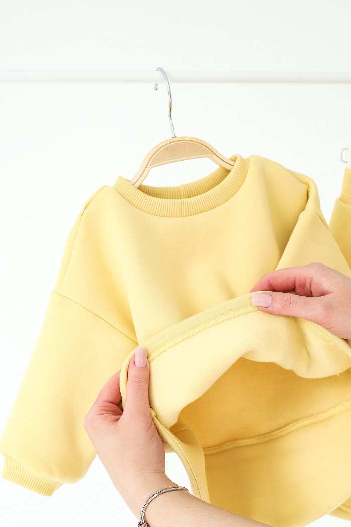Пошит из плотной тринитки на флисе. Ткань мягкая, очень приятная для телу и сохраняет форму даже после многочисленных стирок. Не «кусается», не вызывает раздражения и согревает в прохладные дни.