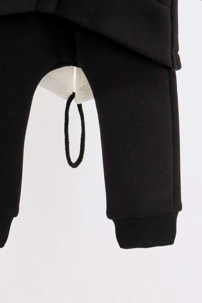 Кофта удлиненная сзади, спинка малыша надежно защищена от ветра, когда кроха приседает. На кофточке и штанишках есть карманы. Утяжка по низу кофты позволяет сделать её более объёмной, по желанию. Капюшон двойной, на хлопковой подкладке. Штанишки с приспущенной матней смотрятся ну очень стильно. Ткань просто неубиваемая - трехнитка с начесом.