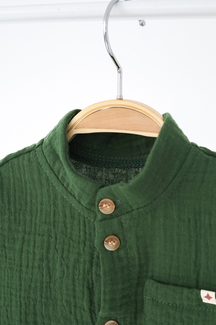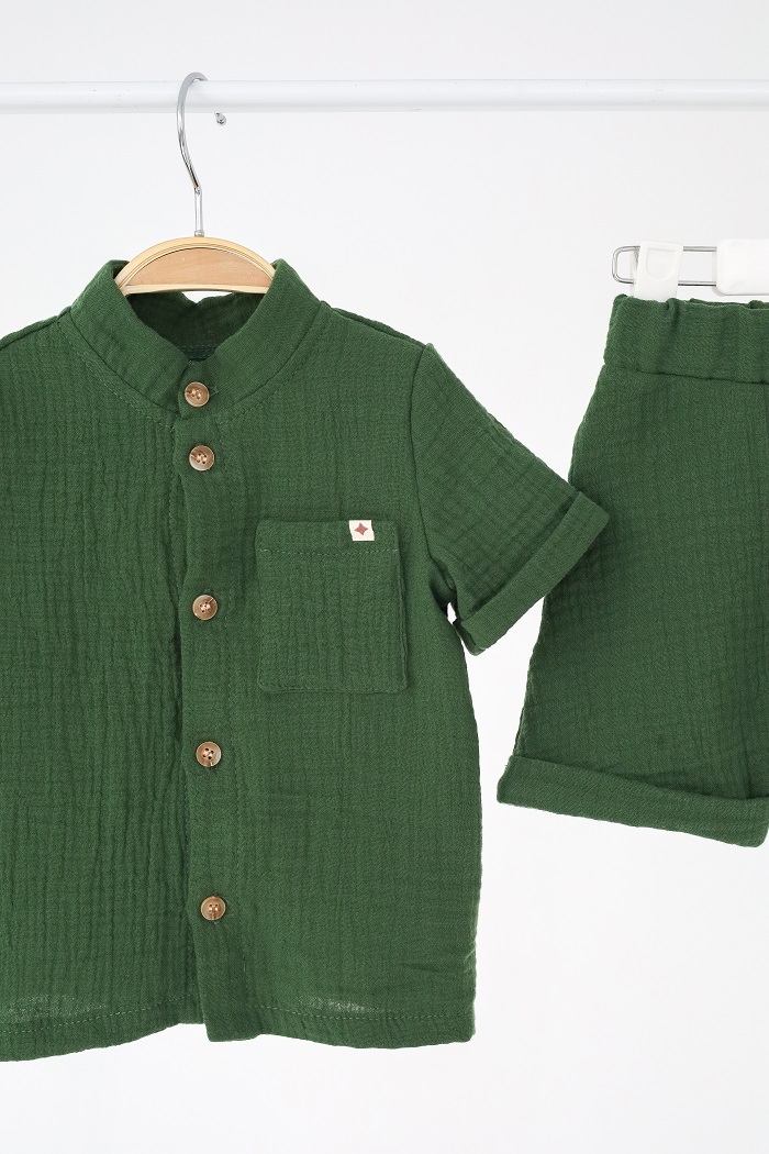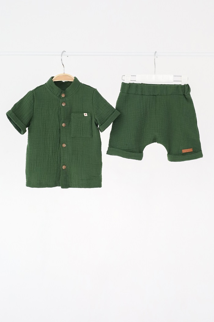 В комплект входят шортики и рубашка на пуговках, которые вы также можете носить отдельно. За счет того, что они однотонные, и шорты и рубашку можно совмещать с практически любыми вещами в гардеробе.