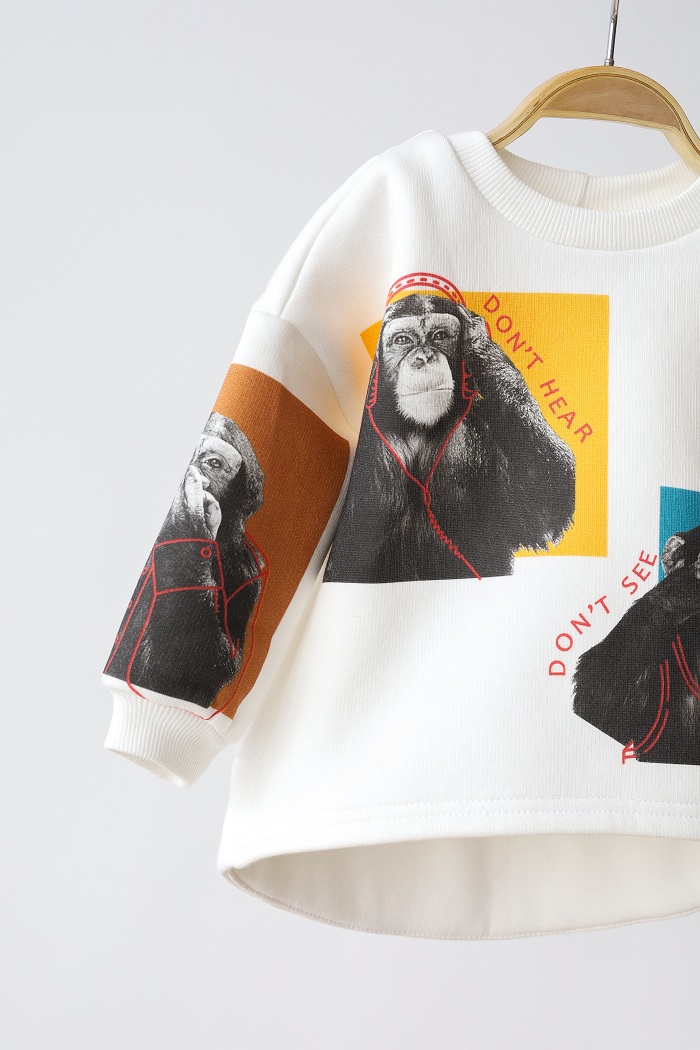 Рисунки с обезьянками выполнены цифровым нанесением. Это означает, что волокна ткани прокрашиваются, а полученное изображение не исчезает из-за стирок, не стирается и не теряет цвет.