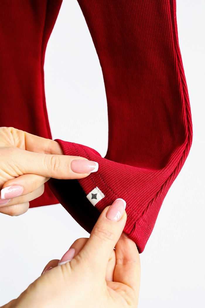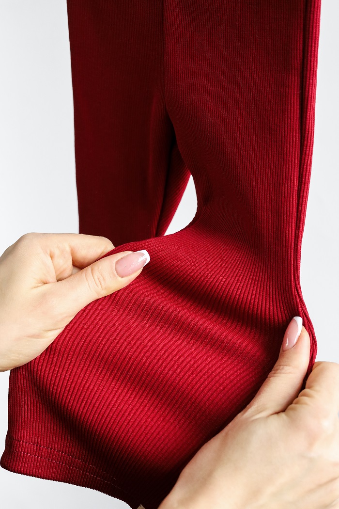 Брюки клеш из мягкого кашкорса в рубчик имеют эластичный пояс, обеспечивающий комфортную посадку на талии. Костюм можно носить как готовый образ, так и в комплекте с другими элементами гардероба.