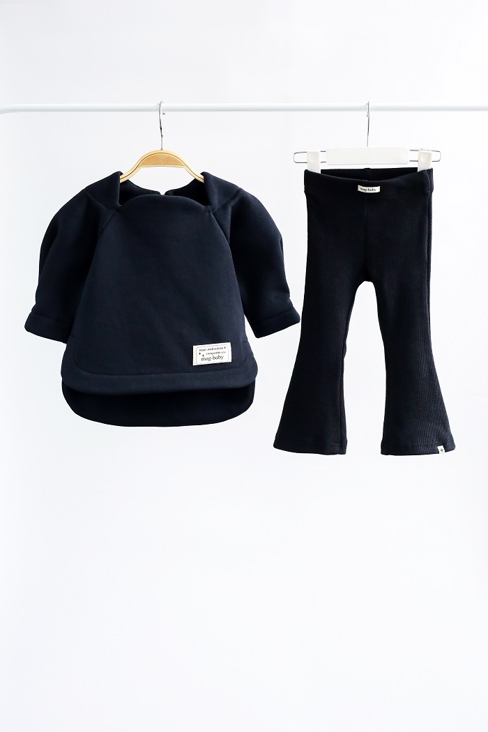 Брюки клеш из мягкого кашкорса в рубчик имеют эластичный пояс, обеспечивающий комфортную посадку на талии. Костюм можно носить как готовый образ, так и в комплекте с другими элементами гардероба.